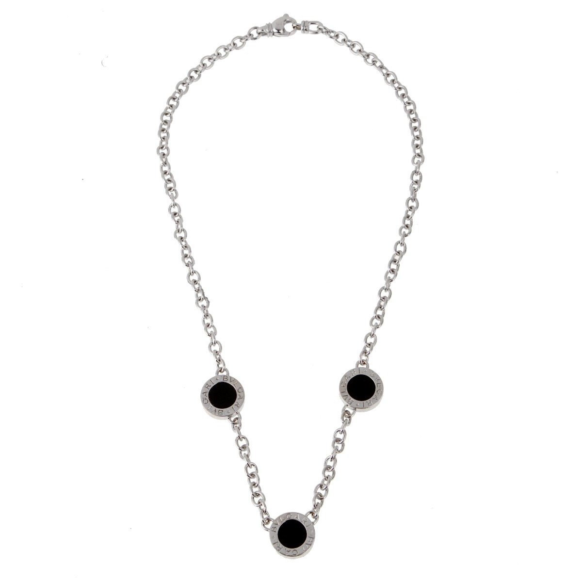 A gorgeous and elegant Bulgari Diamond White Gold necklace. Featuring an innovative reversible design with diamonds on one side and onyx inset on the other. Both the diamonds, which are round brilliant cuts, and the onyx inserts are set in 18k white gold for a classic finish with an artistic flair.