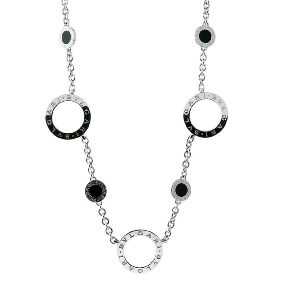A fine Bulgari keepsake, this polished 18K white gold necklace is a wear-anywhere piece of jewelry. Alternating black onyx semi-precious spacer stones and polished Bulgari imprinted circles display the intricate yet contemporary luxury style of the Bulgari brand. The white gold chain gives a sleek and professional but also flirty impression, and the contrast between the dark onyx stones and the gleam from the white gold create the perfect balance between fun and sophistication.