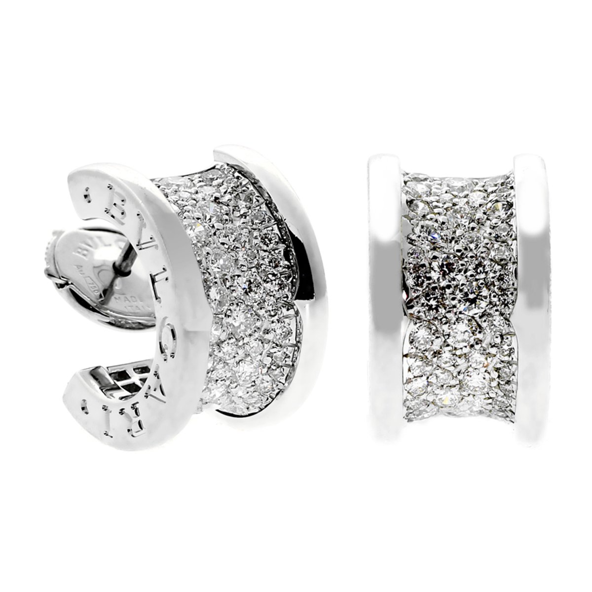 A stunning and glamorous pair of Bzero1 Pave Diamond earrings from Bulgari. These earrings are set with gorgeous Bulgari round brilliant cut diamonds in 18k white gold. Featuring the iconic BVLGARI inscription on either side, these earrings are sure to make a statement. Beautiful and bold, these make a wonderful addition to any collection.