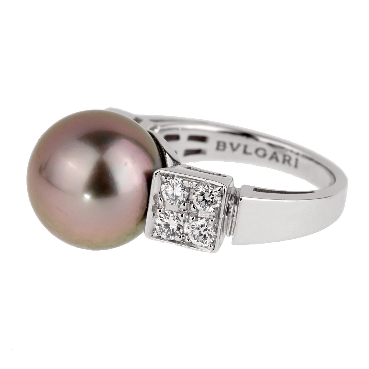 A chic Lucea pearl diamond ring from Bulgari. Featuring a 11.5mm black pearl and adorned with 8 vs1, f color round brilliant cut diamonds, this ring is sure to stand out. The unique black pearl really makes a statement, especially when paired with eight brilliant diamonds. This ring combines old-school class with a more modern flair to create a truly beautiful and unique piece.