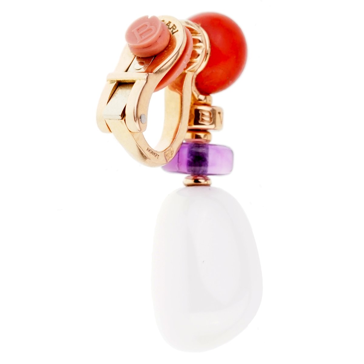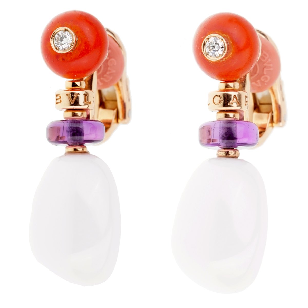 A magnificent pair of Bulgari Mediterranean Eden earrings featuring coral, amethyst, and white agate enhanced with a beautiful round brilliant cut diamond in the coral set in 18k rose gold.