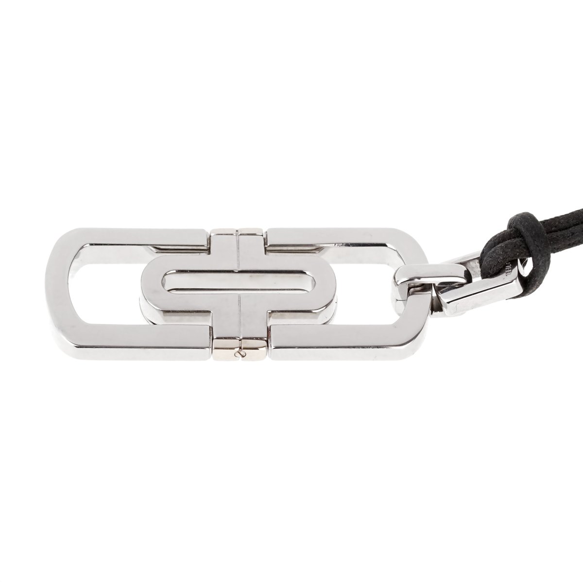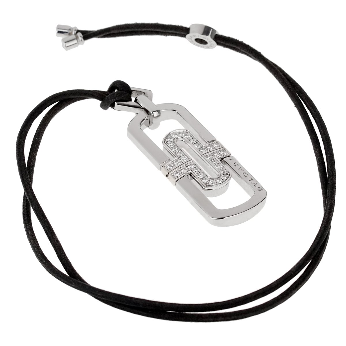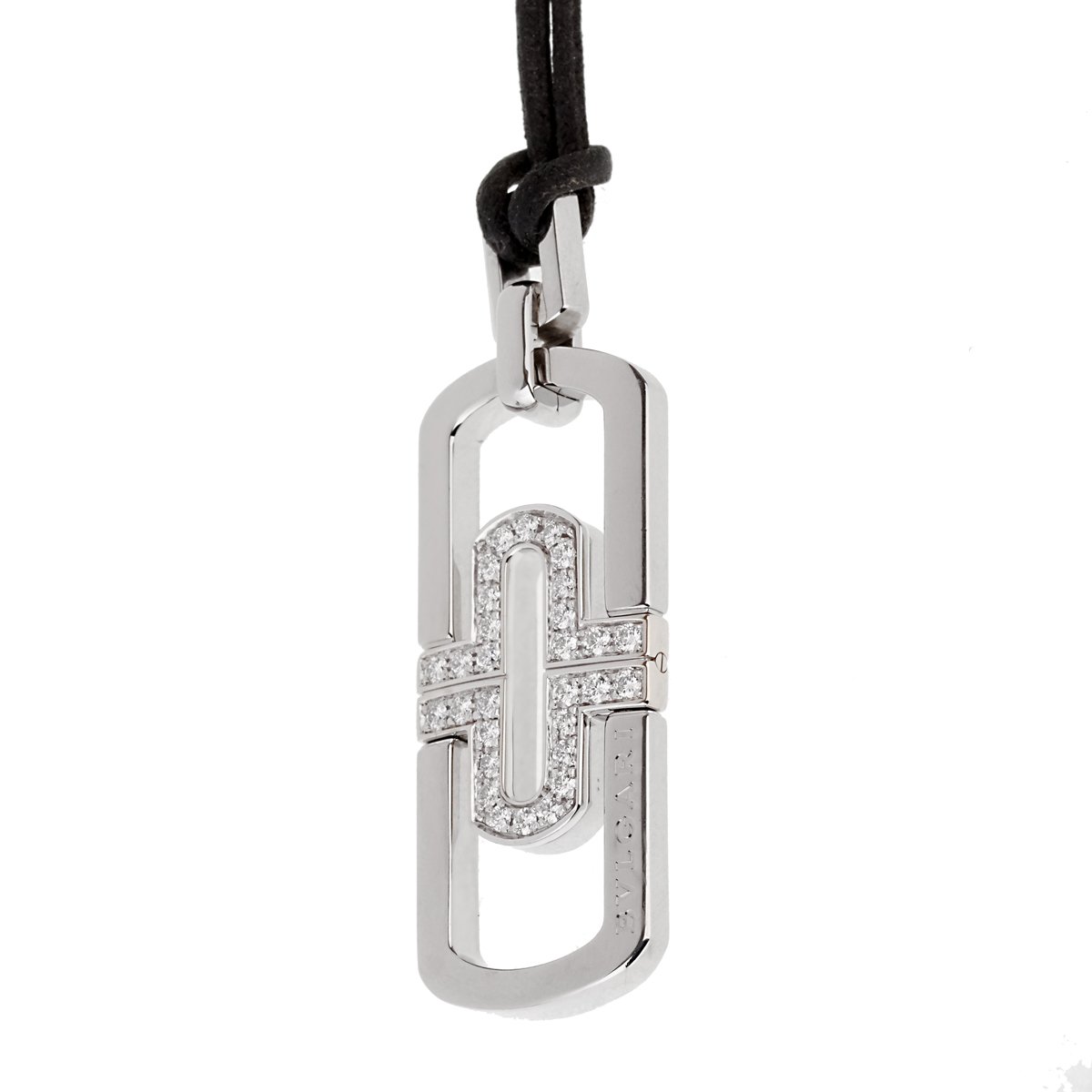 A stunning Parentesi diamond pendant necklace from Bulgari. This necklace features a steel pendant set with .90ct of the finest Bulgari round brilliant cut diamonds in 18k gold. The pendant is suspended by an adjustable necklace that extends up to 24 inches in length. This pendant necklace features a unique design that showcases the quality of the materials and really makes a statement.