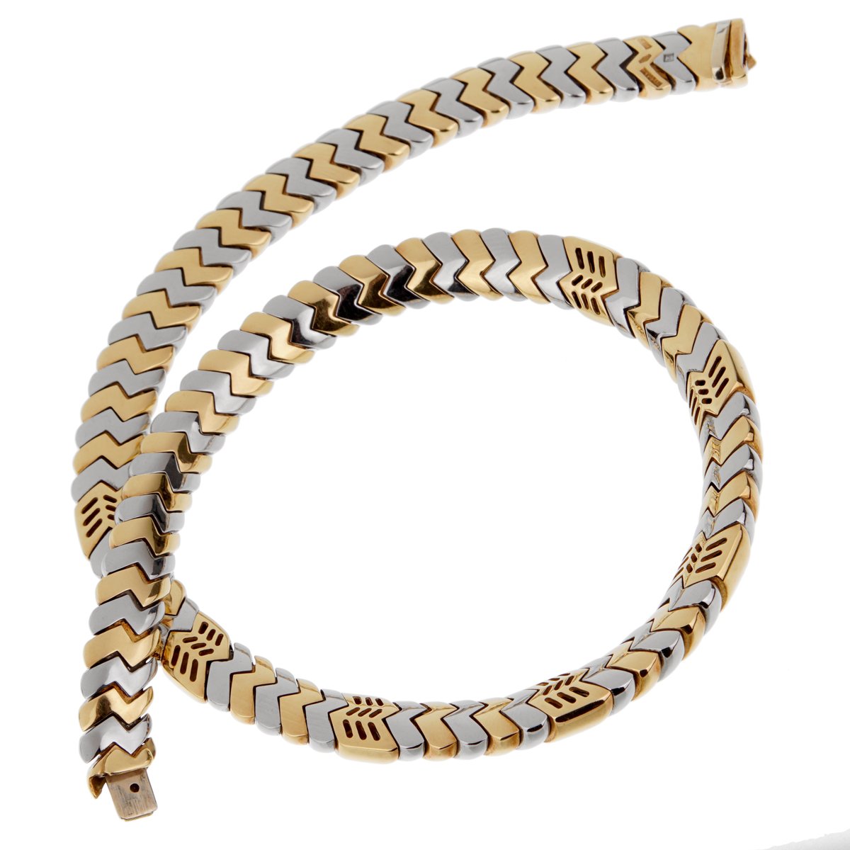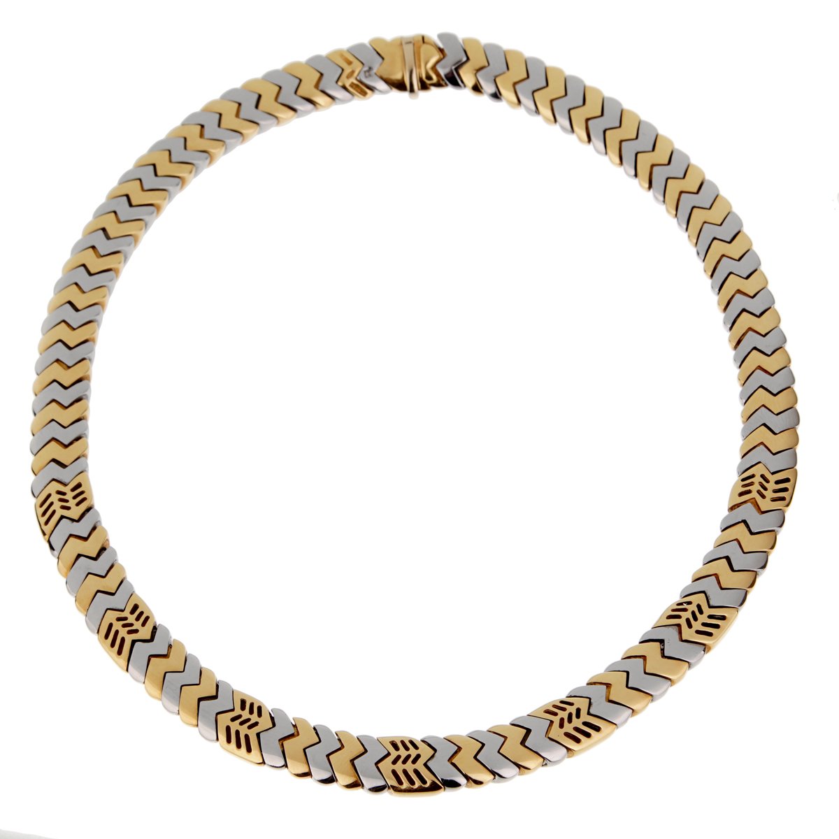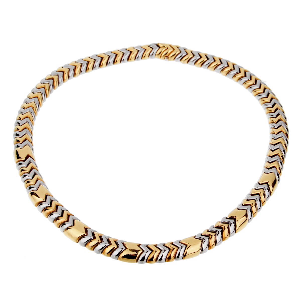 An iconic Bulgari white and yellow gold necklace from the Bulgari Spiga collection. The necklace consists of alternating yellow and white chevrons interlinked together. The necklace measures 15 1/2 inches long and .39" wide with a hidden push in clasp and fold under safety catch.