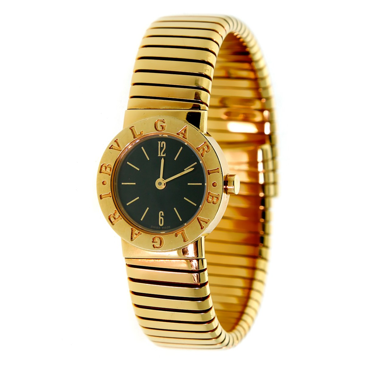 This Bvlgari Tubogas model is finely crafted from solid 18k yellow gold. The black dial features gold stick hands and hour markers with Arabic numerals at twelve and six o'clock, the watch has not been polished and is showing lovely patina.