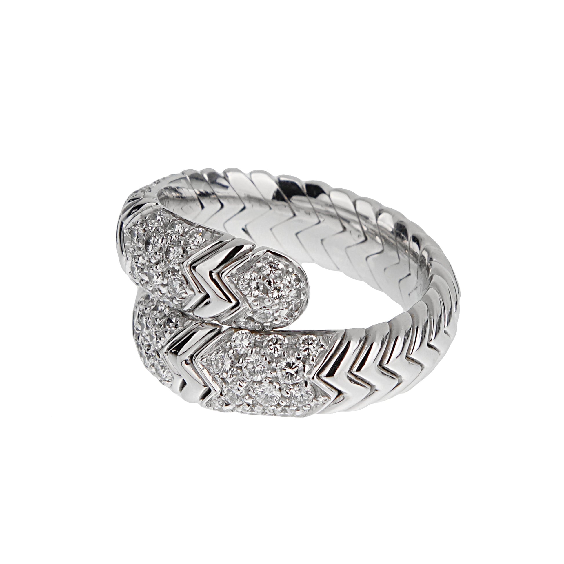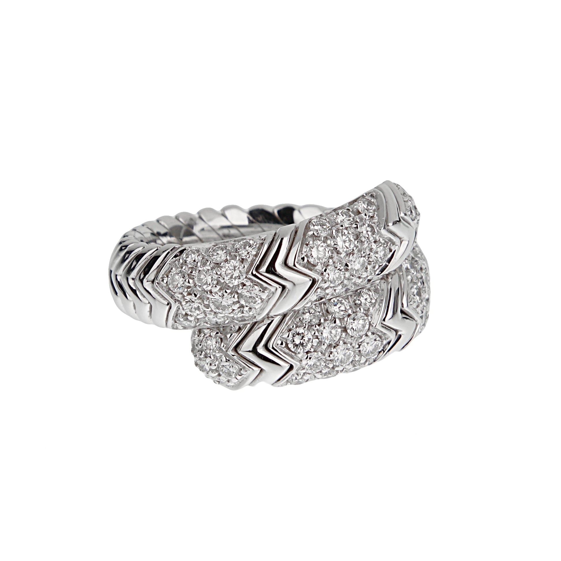 The ring’s design exudes both boldness and refinement. Its crossover silhouette creates a dynamic, sculptural presence, making it a statement piece that captures the light from every angle. The integration of diamonds into the Spiga motif enhances the geometric precision of the design, while softening it with the natural brilliance of light. This interplay between strength and grace is a hallmark of Bvlgari’s artistic vision.