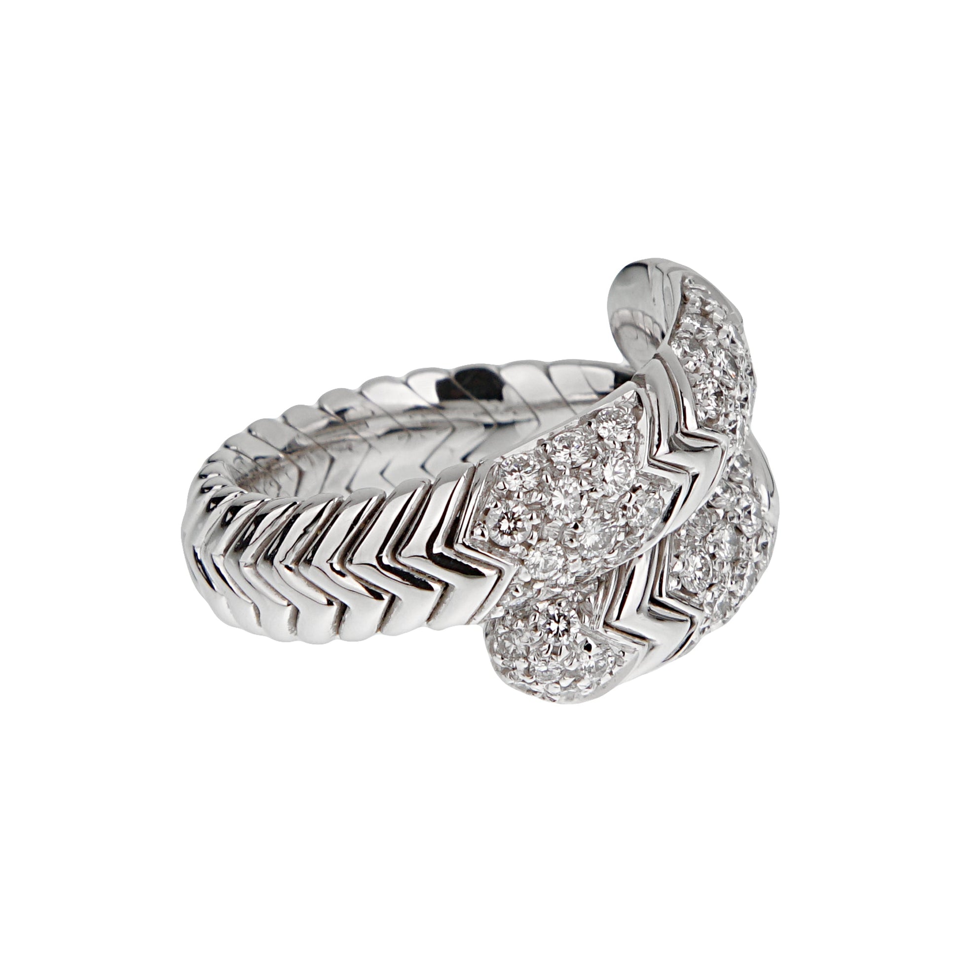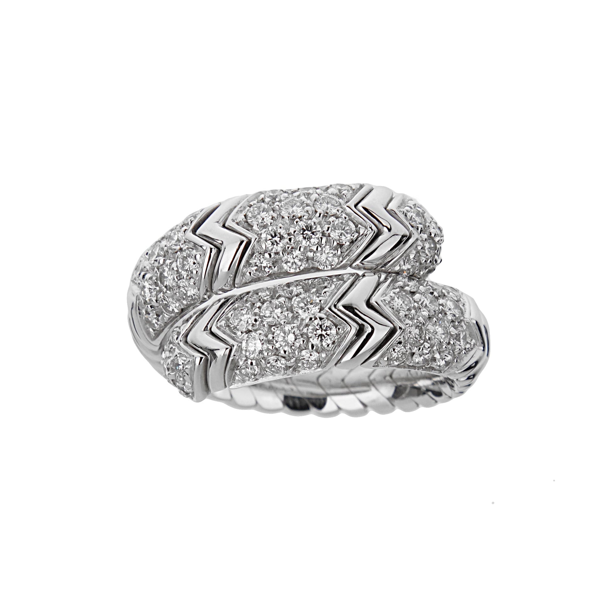 Crafted from luminous 18k white gold, the band showcases Bvlgari’s signature architectural style through bold, chevron-patterned links that interlock seamlessly around the finger. The sculptural design offers both strength and fluidity, echoing the motif of an endless cycle. Enhancing this already striking foundation, the upper surface of the ring is luxuriously set with a field of pavé-set round brilliant-cut diamonds. These diamonds shimmer with exceptional fire, creating a radiant contrast against the cool gleam of polished white gold.