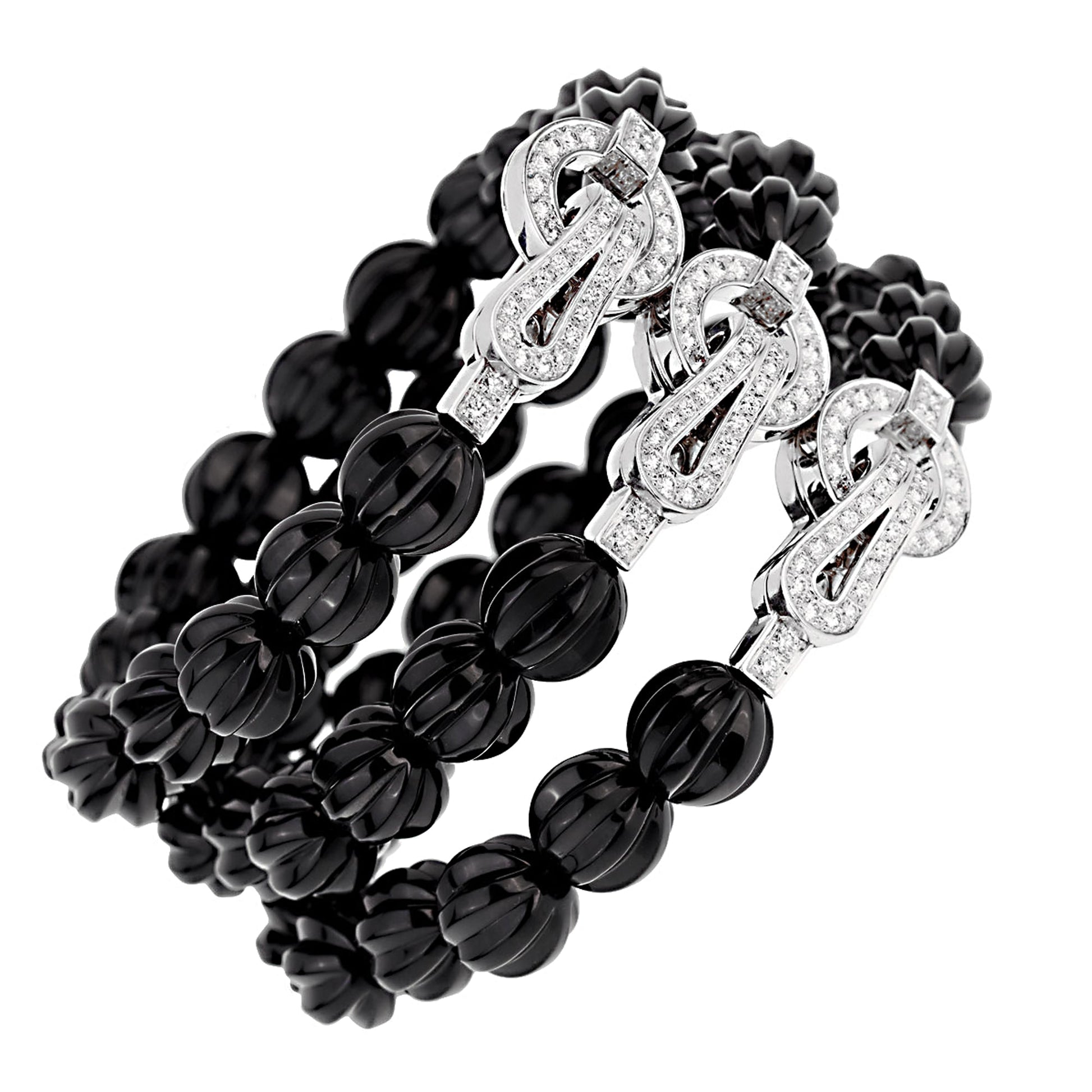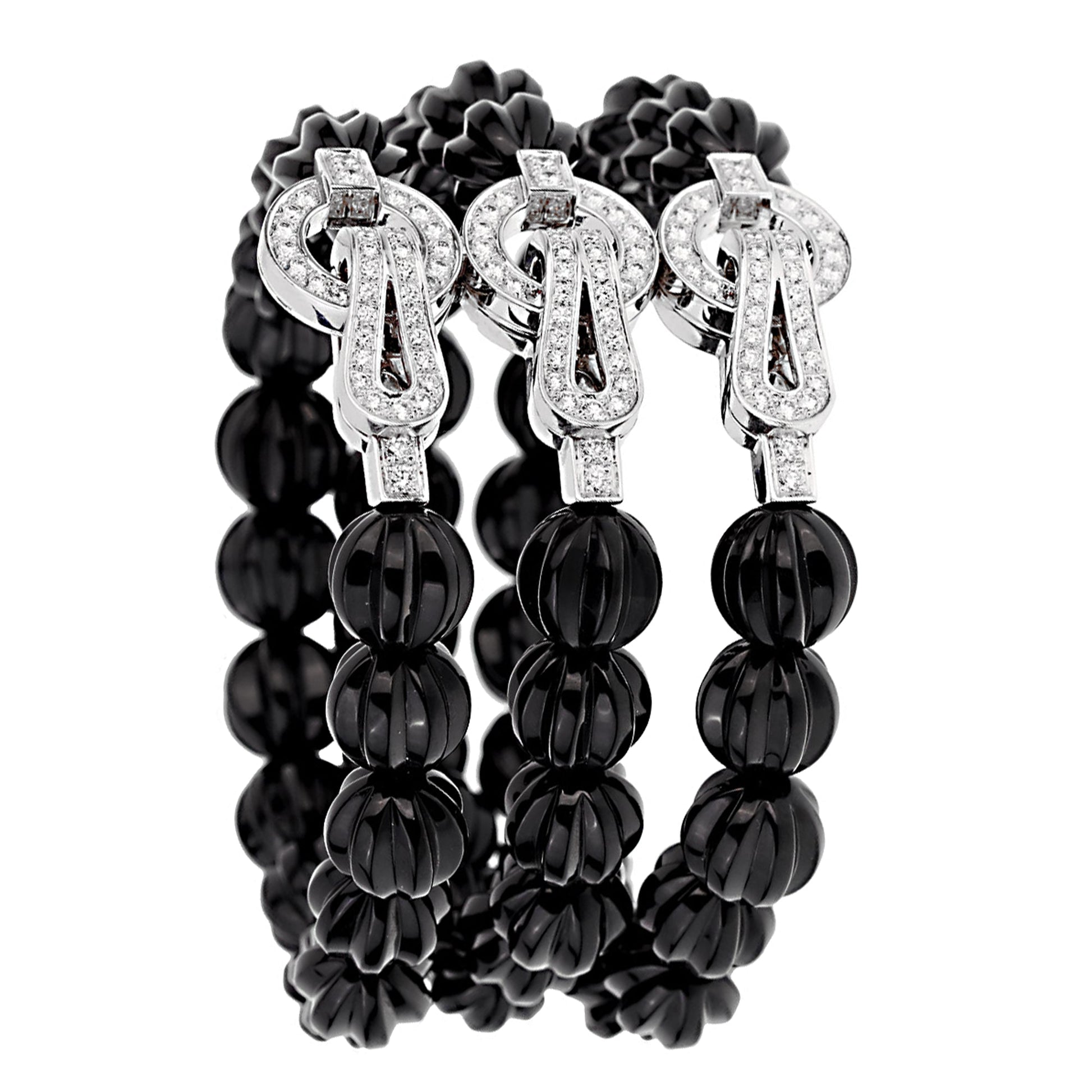 Serving as the bracelet's standout feature, the Agrafe clasp is a hallmark of Cartier's innovative design. The clasp, taking inspiration from the original designs used in Cartier's 1930s collections, is meticulously crafted from 18k white gold. An ensemble of shimmering, ethically sourced diamonds generously adorns the Agrafe clasp, producing an eye-catching sparkle that complements the mysterious allure of the onyx beads.