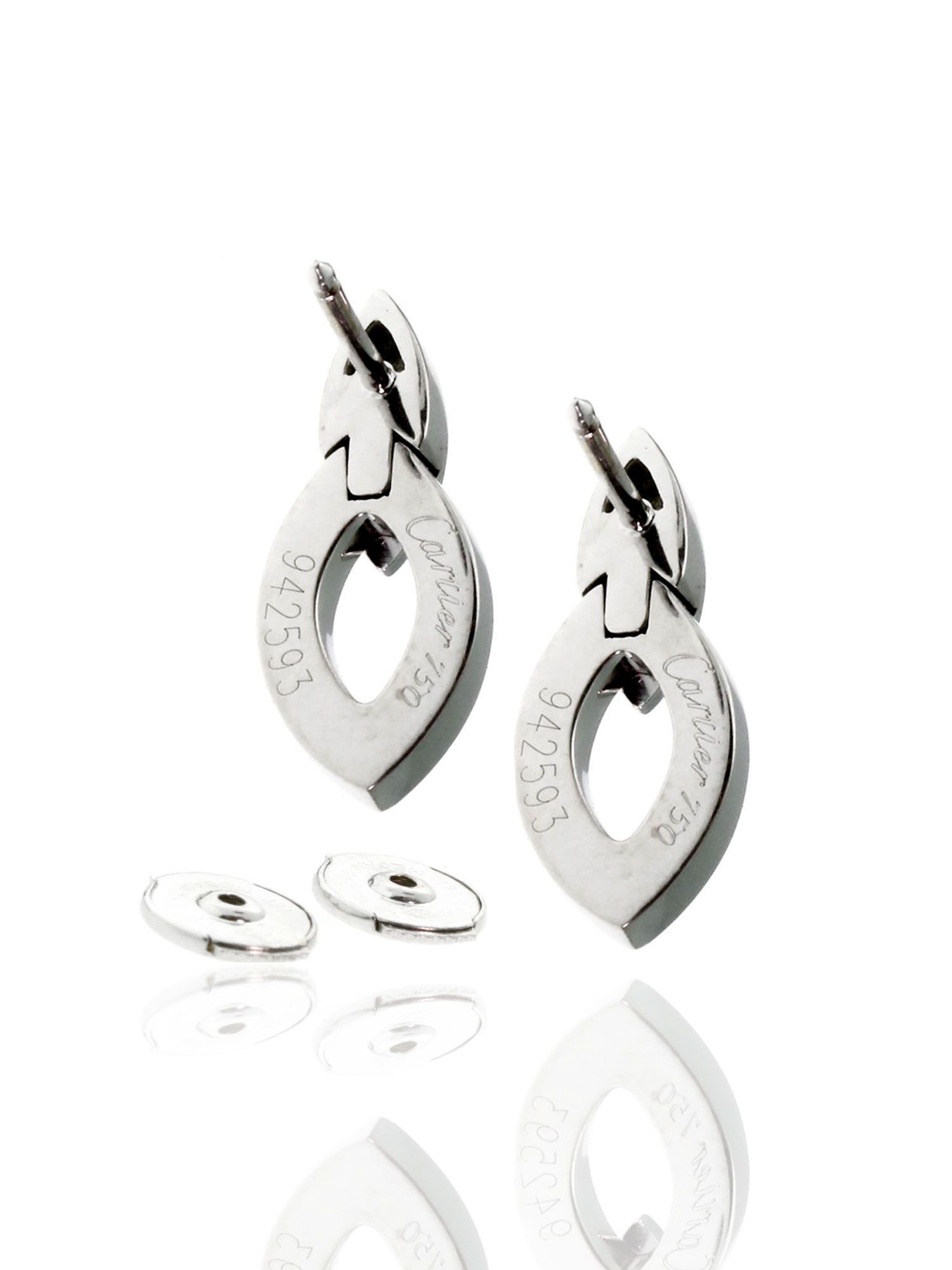 A chic pair of authentic Cartier earrings featuring 6 of the finest Cartier round brilliant cut diamonds set in shimmering 18k white gold.