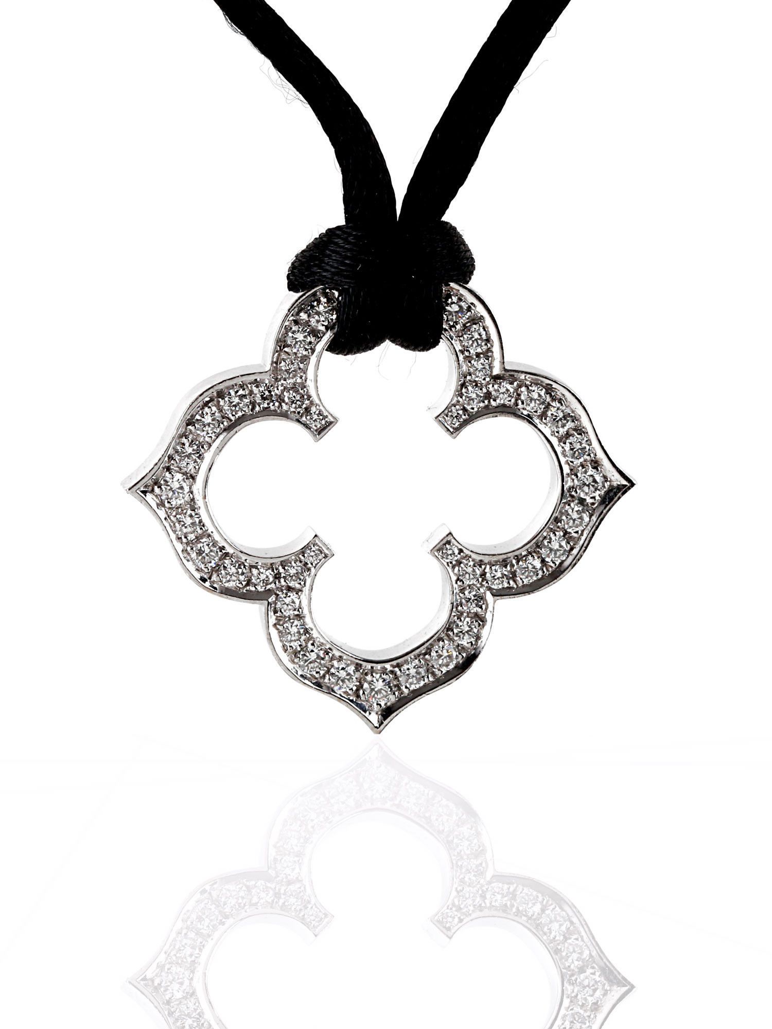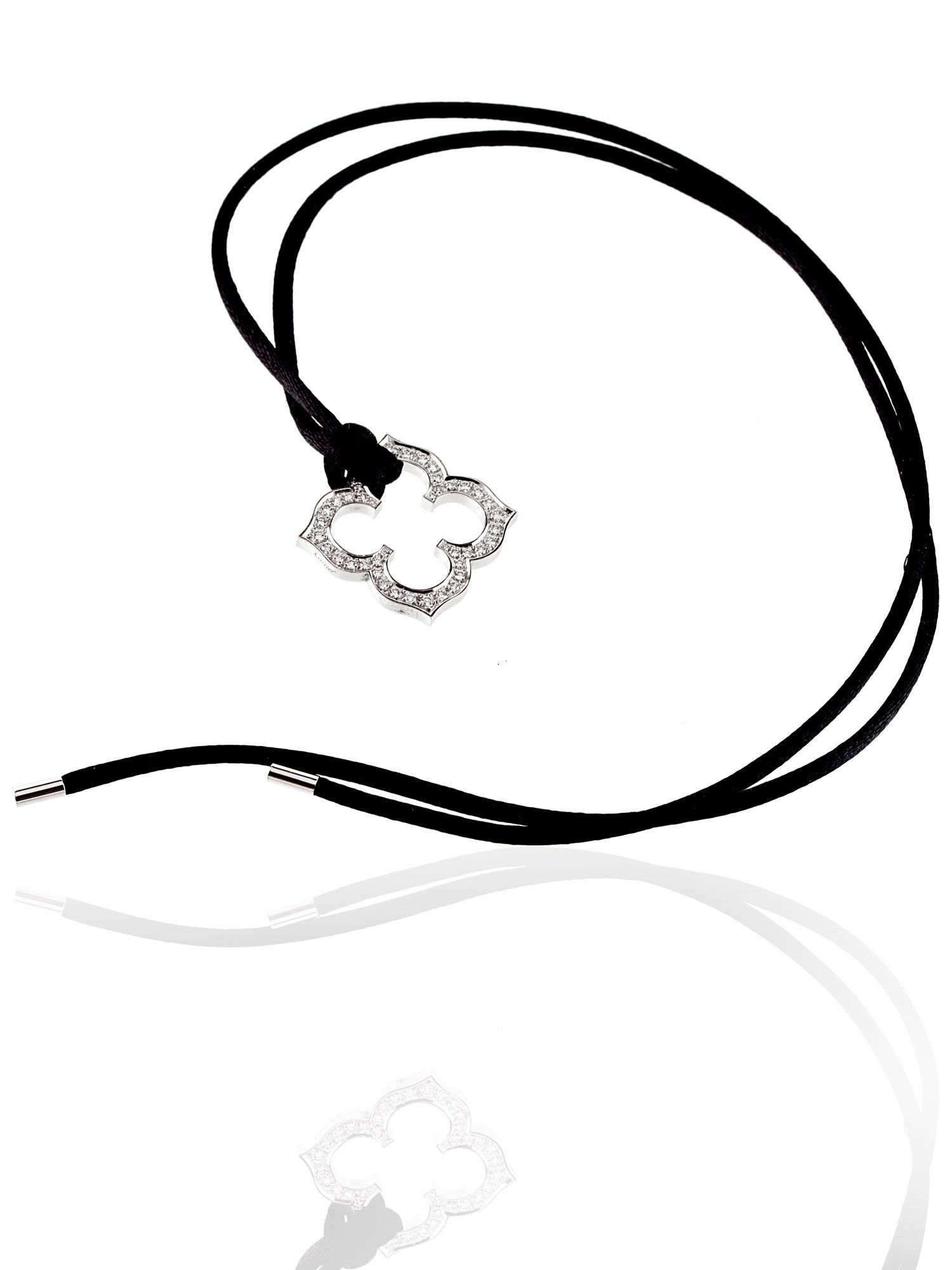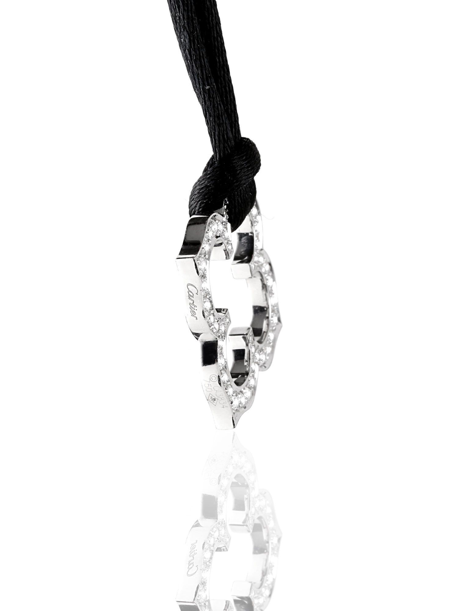 Proving that sometimes all that glitters actuallyis gold, this 18k White Gold Diamond Necklace from Cartier brings Diamonds and Gold together in a fabulous motif which evokes the very best of both materials. The black 24" necklace serves as a well-chosen companion to the brilliant motif, providing both aesthetic balance and adjustable styling options.
