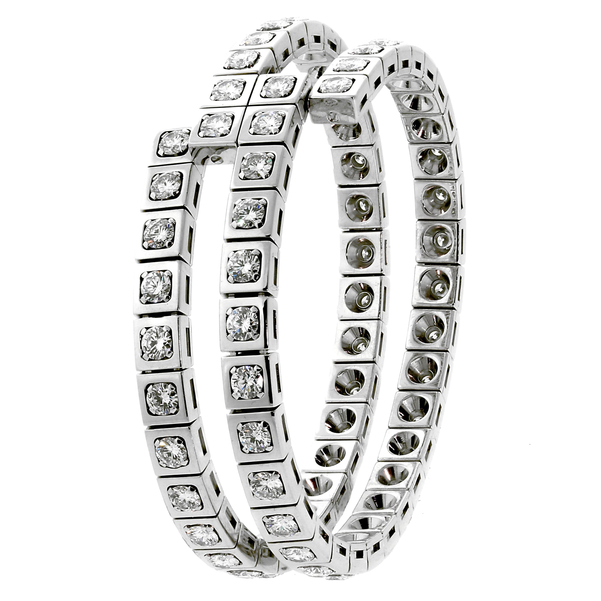 Set into the lustrous metal are approximately 9.9cts of round brilliant cut diamonds, meticulously selected for their color, clarity, and cut. Each diamond, ethically sourced, glows with a mesmerizing brilliance that captures the light from all angles, creating a dazzling dance of sparkle that enwraps your wrist.