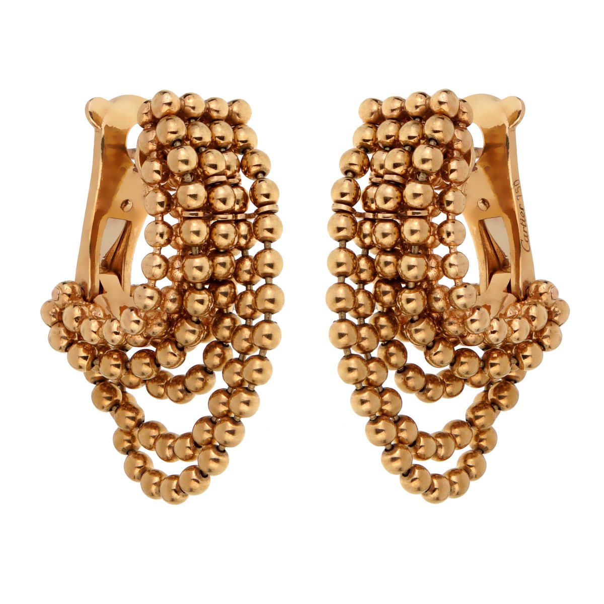 A magnificent set of authentic Cartier earrings featuring a beaded design in shimmering 18k yellow gold.