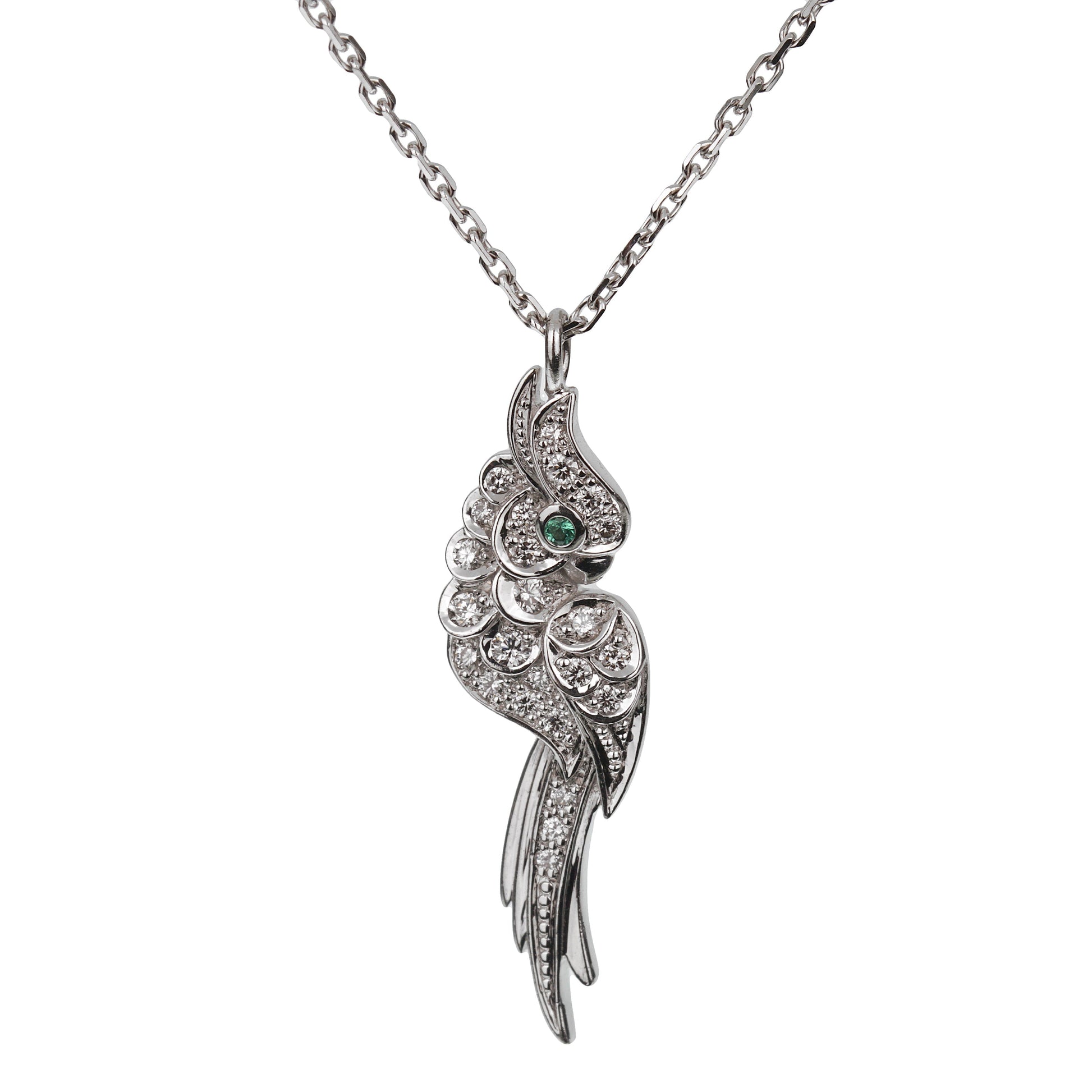 Adding a touch of color and life to the pendant is a single emerald, set as the bird's eye. This emerald is carefully chosen for its vibrant green hue, which contrasts beautifully with the white gold and diamonds. The emerald adds a sense of depth and character to the pendant, making it a unique and eye-catching feature. The combination of diamonds and emerald in this piece exemplifies Cartier's expertise in blending different gemstones to create harmonious and visually stunning designs.