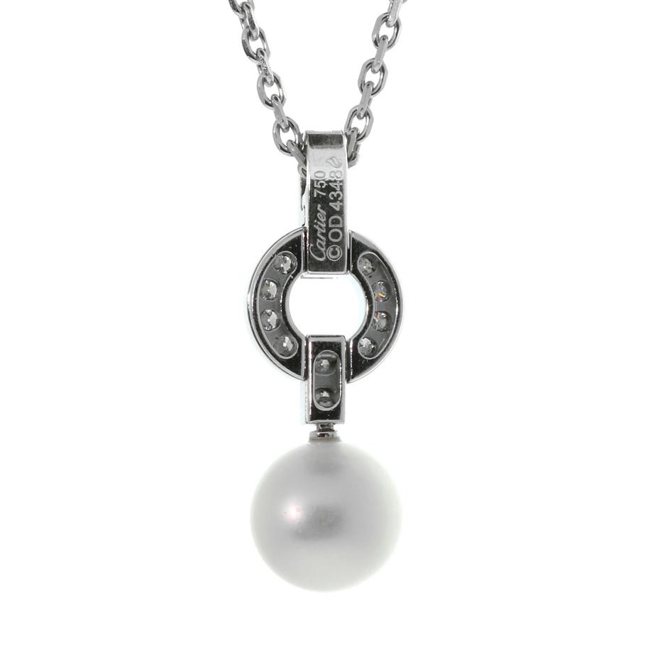 This lovely Cartier diamond gold pendant is set with approximately .25 carats of exquisite diamonds in 18k Cartier white gold. The white gold pendant is finished by a single pearl drop, and it is set throughout with Cartier round brilliant cut diamonds.