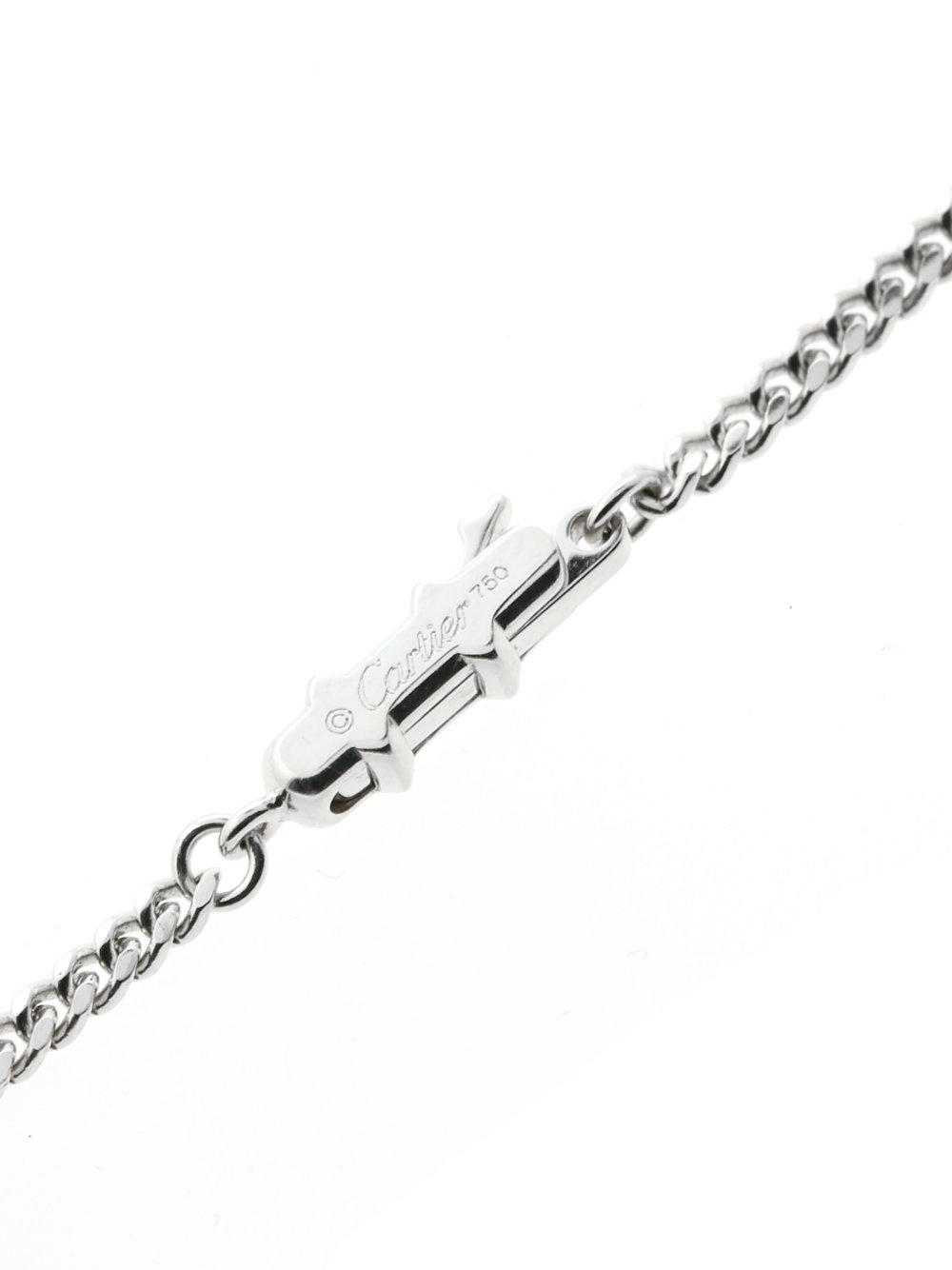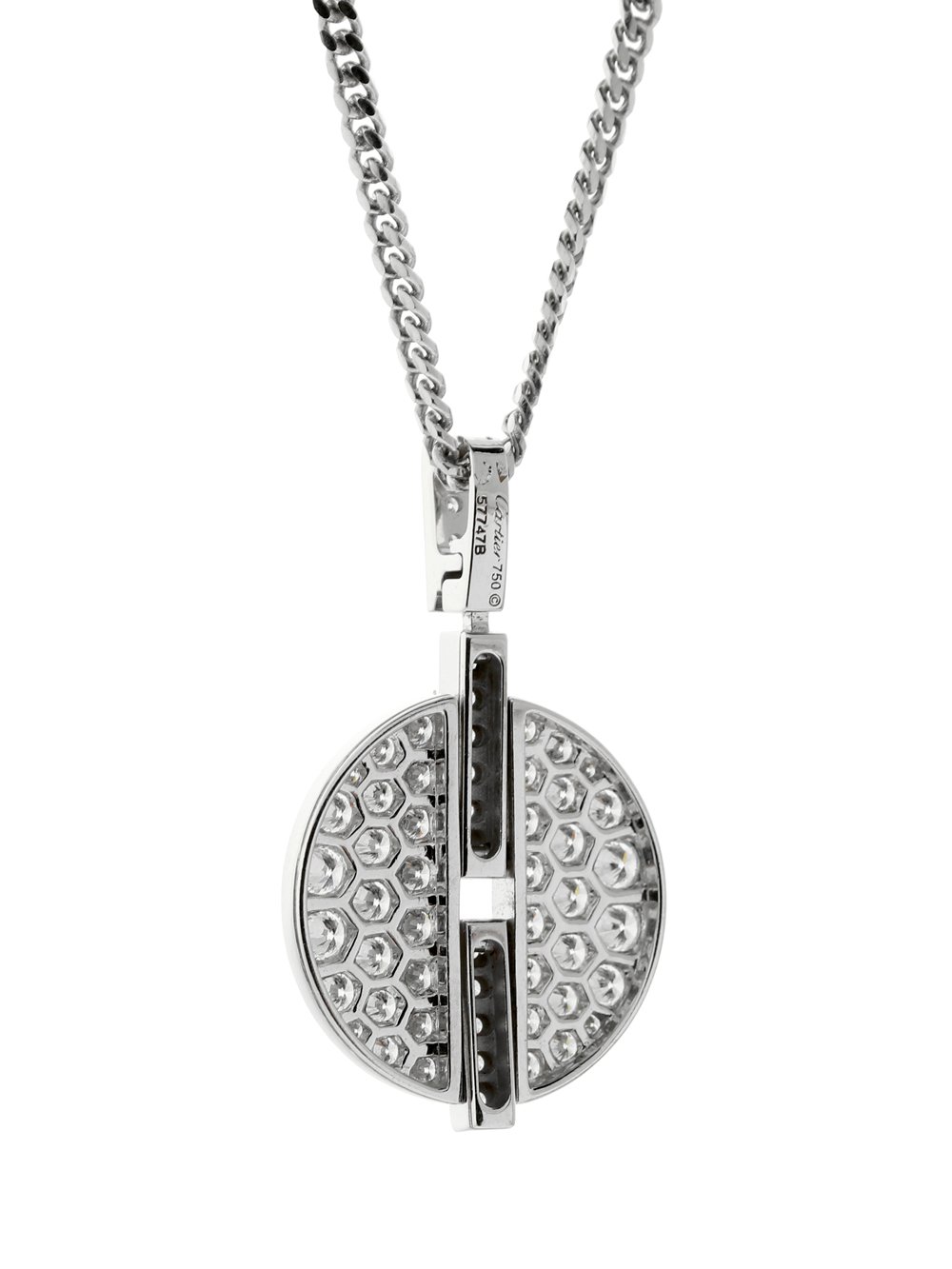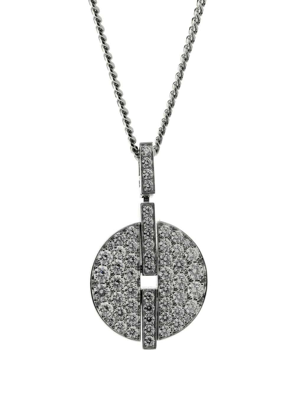 This lovely Cartier diamond gold pendant is set with approximately 1.2 carats of exquisite diamonds in 18k Cartier white gold. The circular white gold pendant is bisected by horizontal bars of white gold, and all are set with Cartier round brilliant cut diamonds.