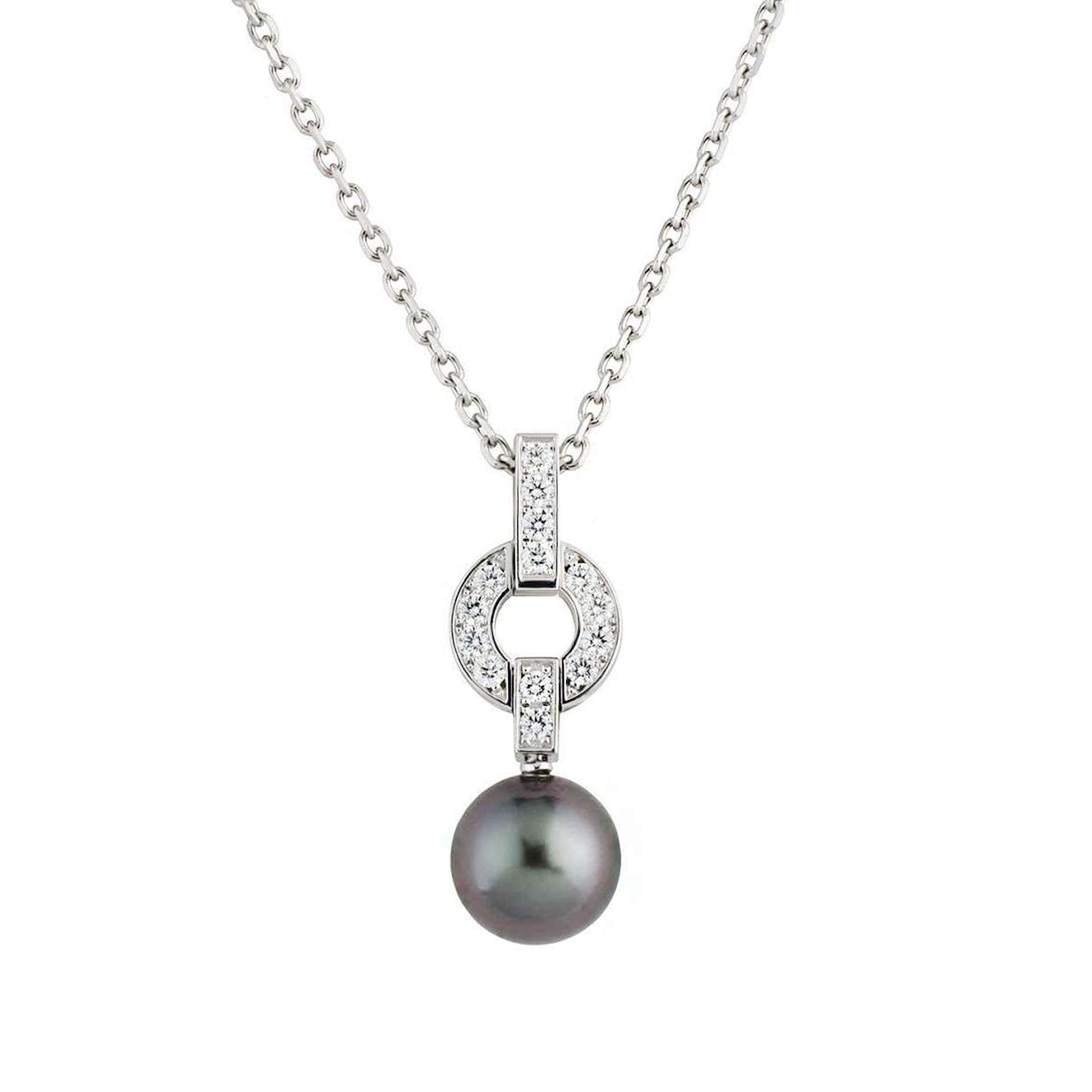 The pendant of the necklace is the focal point, featuring a stunning black pearl. The pearl's lustrous surface and rich, dark hue create a captivating contrast against the brilliance of the surrounding diamonds and the gleaming white gold setting. The pearl is perfectly round and smooth, exemplifying the highest standards of quality and craftsmanship.