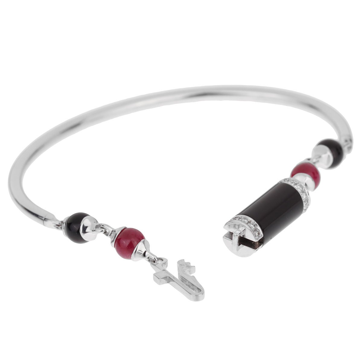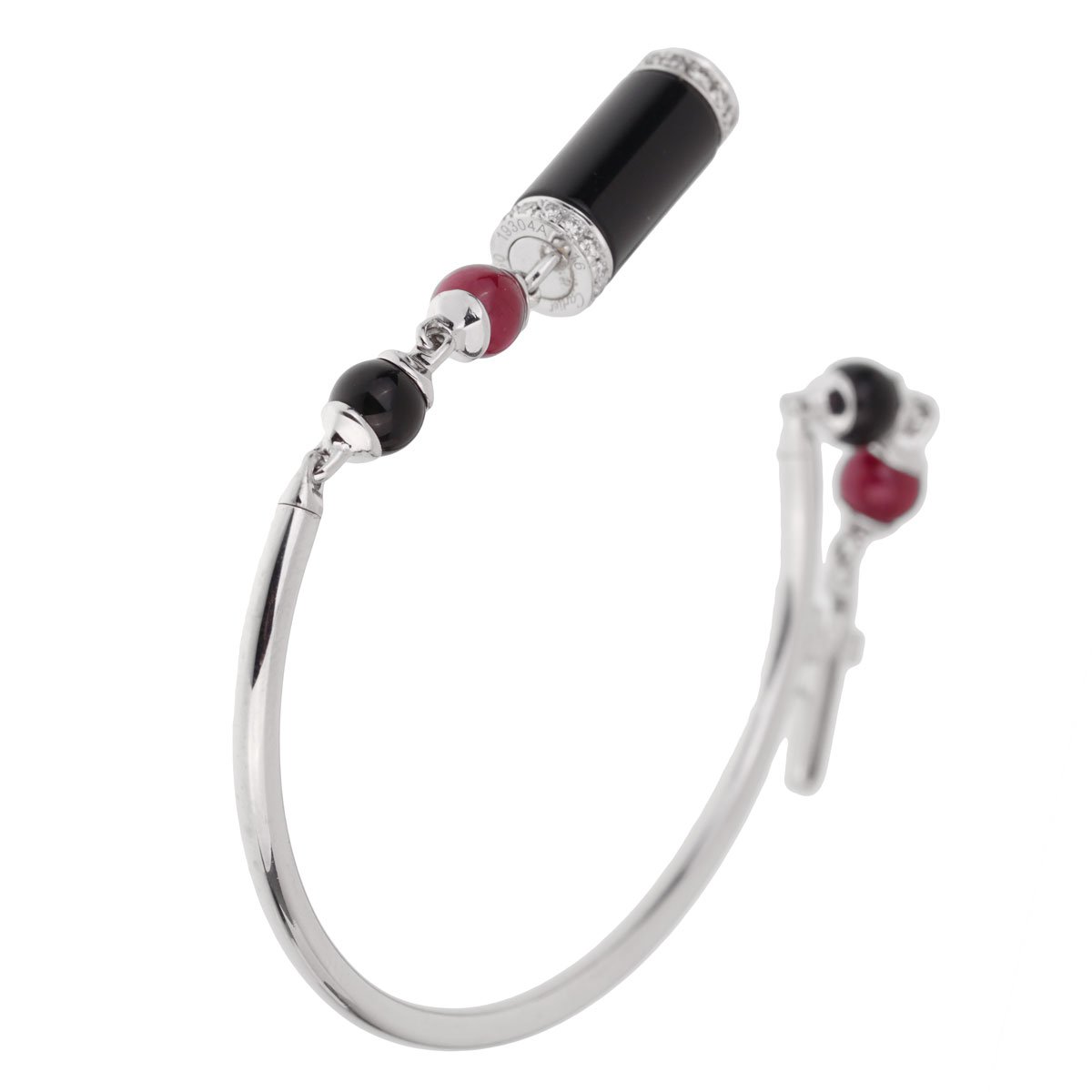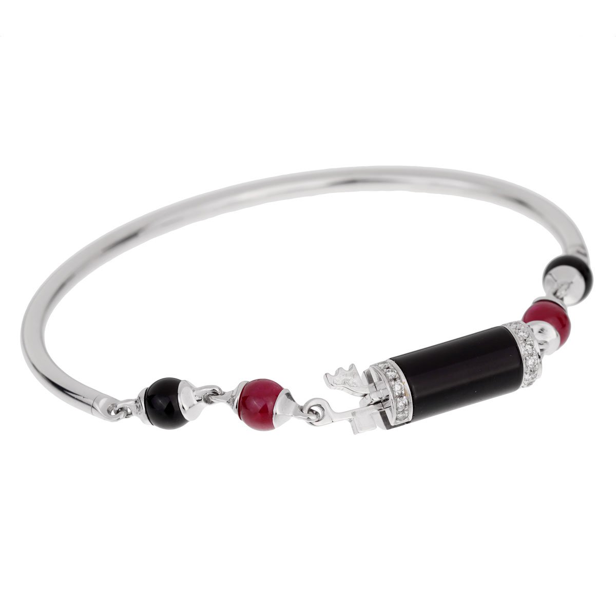 A chic Cartier bracelet from the Le Baiser du Dragon collection carefully crafted in 18k white gold, the bracelet features ruby, and onyx stations adorned with round brilliant cut diamonds on the central locking mechanism.