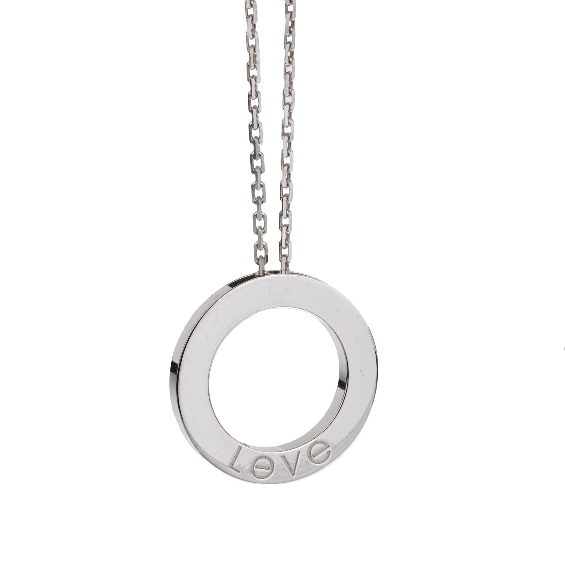 The centerpiece of the necklace is its iconic circular pendant, featuring Cartier’s signature screw motifs. These motifs, inspired by the Love collection’s theme of eternal commitment, evoke a sense of permanence and devotion. The smooth, polished surface of the white gold reflects light beautifully, adding a radiant luster that enhances its sophisticated aesthetic.
