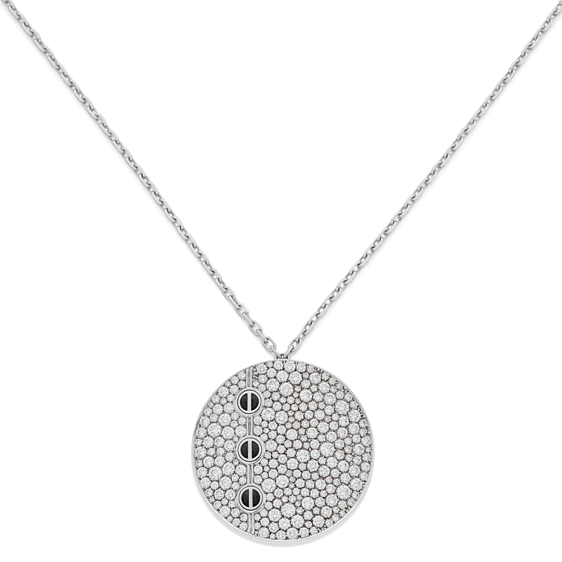 The centerpiece of this necklace is the three black ceramic Love motifs, a distinctive and renowned symbol of Cartier's eternal theme - Love. Each motif is crafted with precision, offering a mesmerizing contrast against the sparkling diamonds. The monochromatic palette of this piece not only ensures versatility but also a timeless elegance, making it a perfect addition to any jewelry collection.