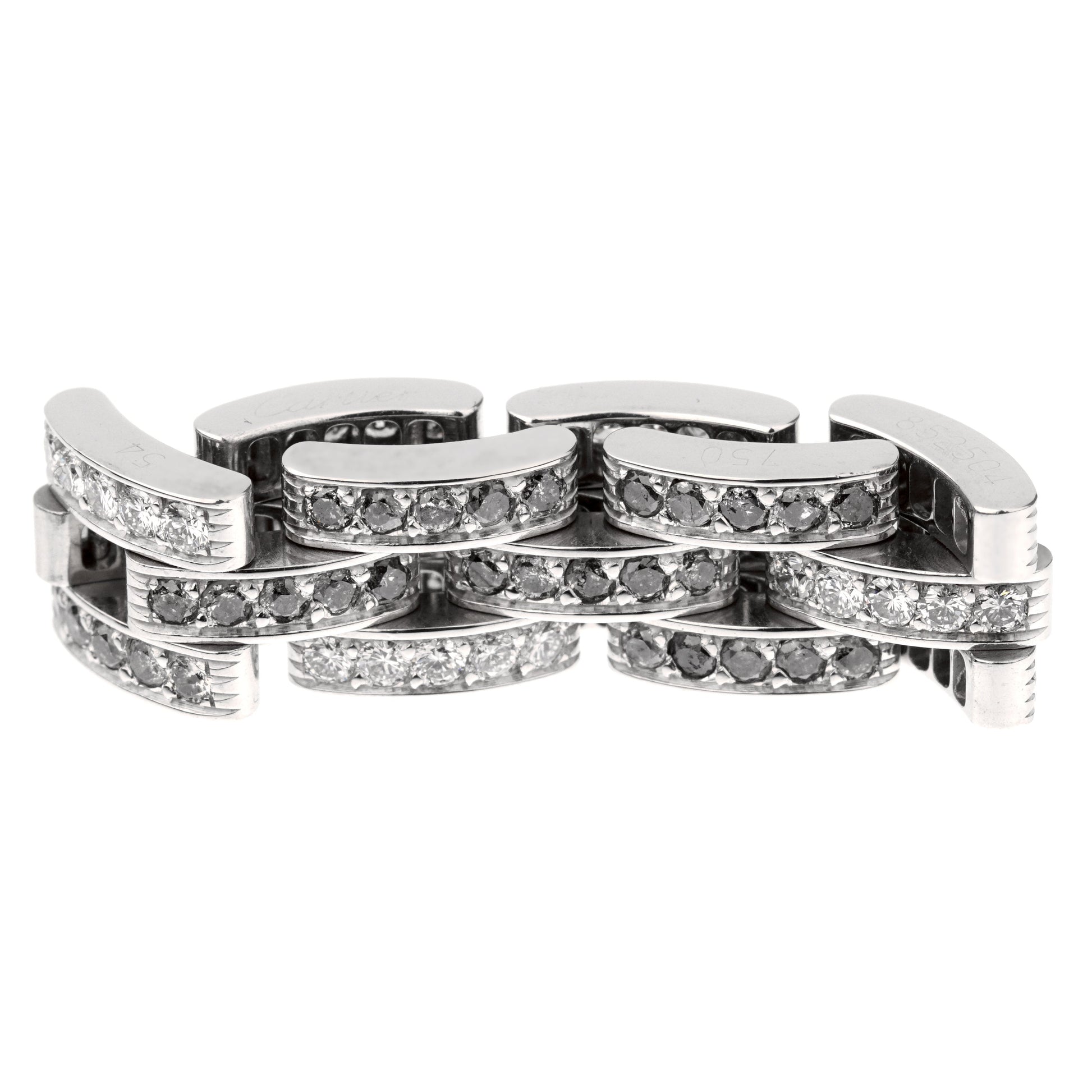 While it contains all the elements of a classic and timeless design, this luxury Cartier ring has a fresh contemporary feel that will set you apart from the crowd. This wide ring features three diamond-studded rows. Unlike more traditional designs, however, each row is made up of horizontal bars that give the ring the appearance of being made up of links. Round brilliant cut diamonds are pave set in each white gold link, creating a three-tiered modern eternity band like no other ring you will find.