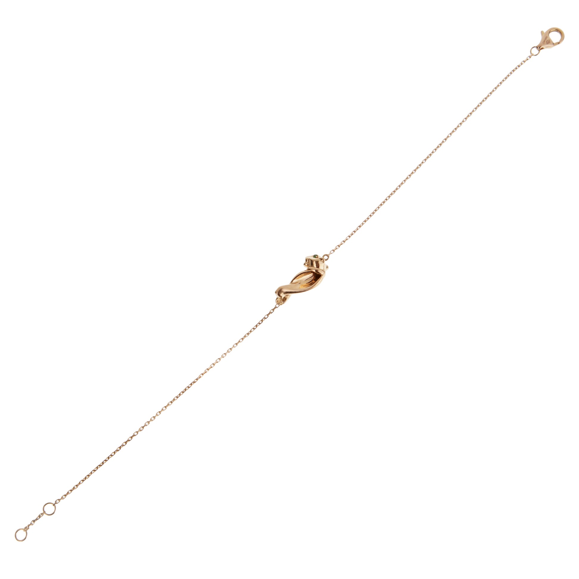 The panther's head is adorned with two vivid green tsavorite garnet eyes that add a captivating, feline intensity to the piece, a hallmark of Cartier’s attention to detail and luxury craftsmanship. The charm is gracefully affixed to a delicate rose gold chain, offering a lightweight and comfortable wear that drapes elegantly on the wrist.