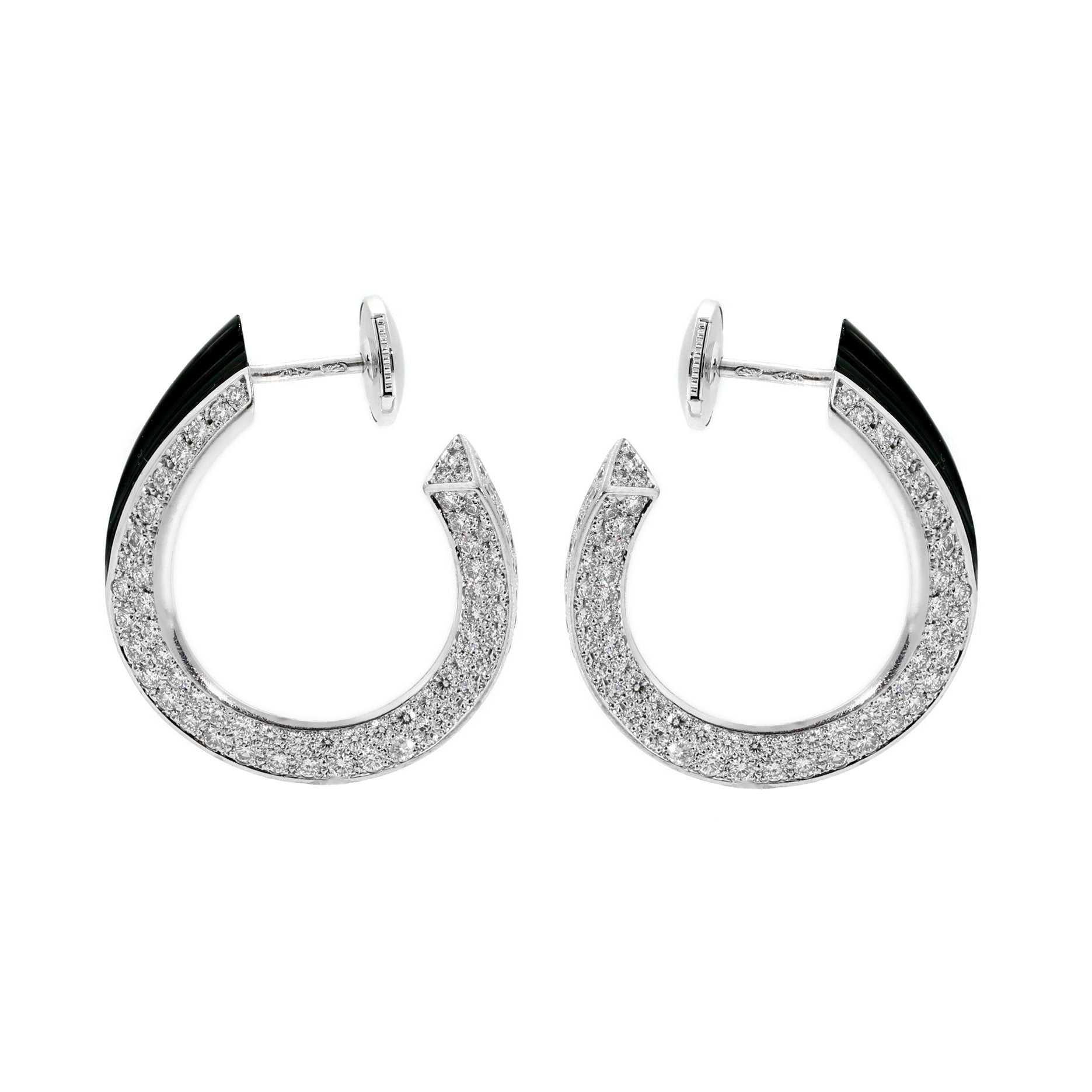 These classic Cartier Panthere earrings are adorned with the finest Cartier round brilliant cut diamonds and onyx set in 18k white gold. Cartier Panthere diamond onyx white gold earrings; an extraordinary pair of earrings from the renowned Panthere de Cartier collection!