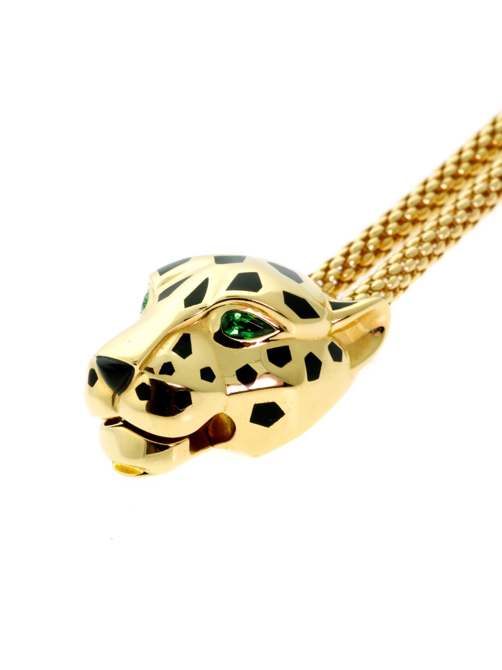 Detailing and one-of-a-kind design elements come together to form Cartier's Panthere bracelet. Black spots adorn the animal's head while Tsavorite eyes create a menacing glow. Made from 18-karat yellow gold and featuring onyx, tsavorite garnets and round brilliant cut diamonds Cartier's Panthere bracelet is an eye catcher! With it on your wrist, you'll display the side of your personality that's courageous and chic.