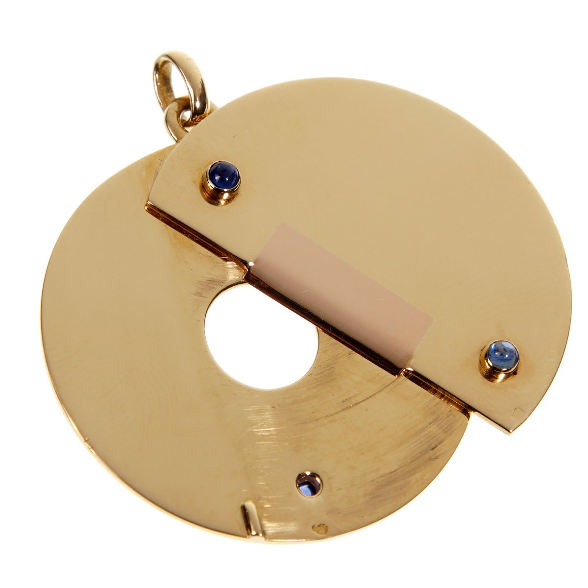 Accenting this exceptional piece are four sapphire cabochon stones. These sapphires, renowned for their deep blue hue and smooth dome shape, are meticulously set to provide a captivating contrast to the yellow gold. Their rich color and intriguing form add a touch of opulence, enhancing the pendant's overall elegance.