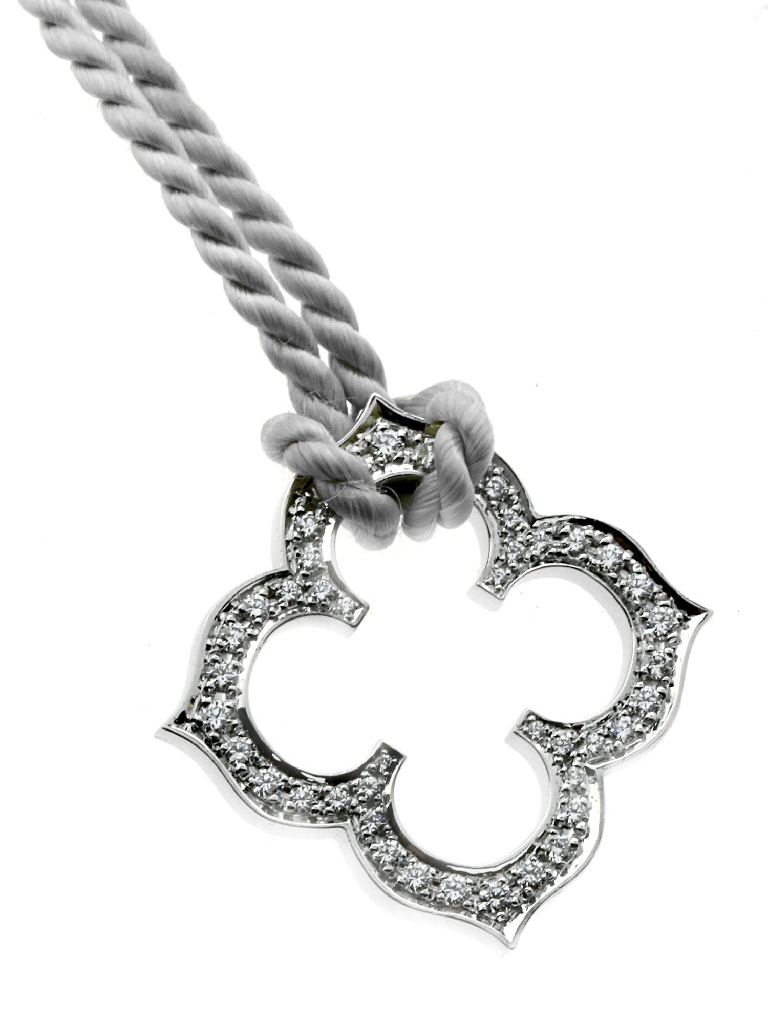 A fabulous Cartier floral motif pendant is set with approximately 1 carat of the finest Cartier round brilliant cut diamonds in 18k white gold.