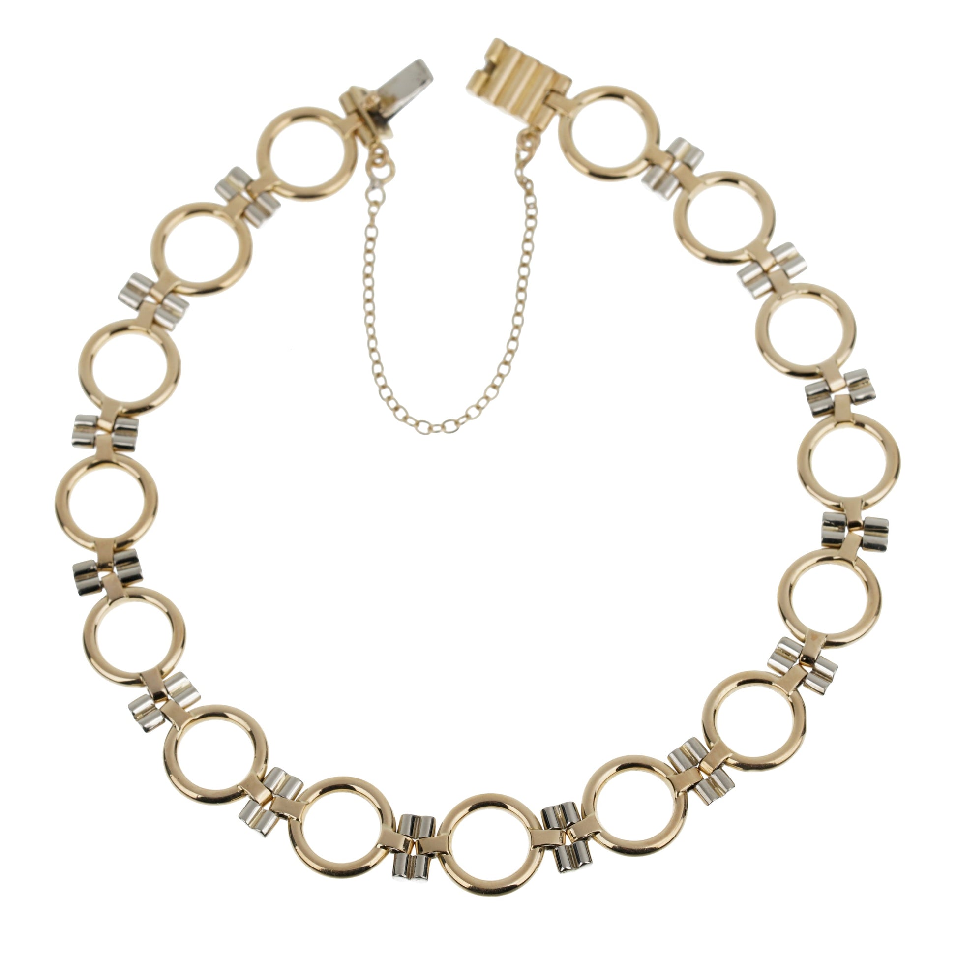 The yellow gold circles imbue the bracelet with a warm, vibrant luster that radiates opulence, while the white gold bars offer a sleek, contemporary counterpoint that catches the light with every movement. This alternating pattern exudes a rhythmic beauty and a sense of balance, making the bracelet a versatile accessory for both day and evening wear.
