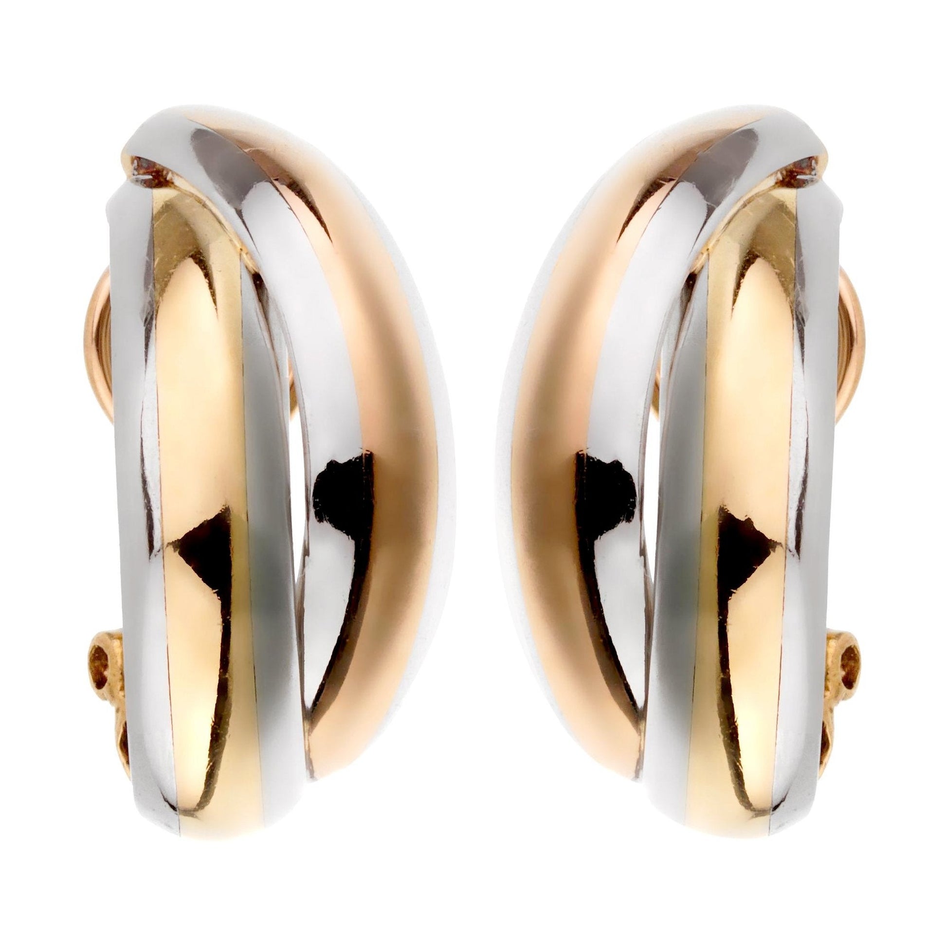 A vintage pair of Cartier Trinity earrings circa 1990s showcasing yellow and rose gold intertwined with stainless steel. The chic earrings are perfect for everyday wear. The earrings measure .82" in length by .35" wide.