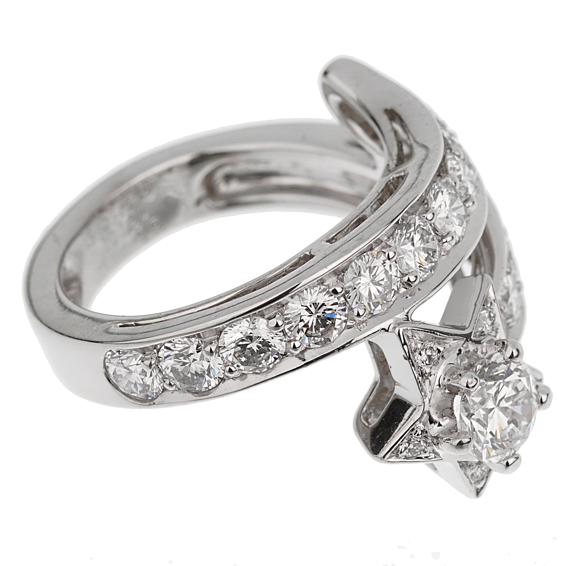 This ring is the perfect example of chic late 90's early 2000s style. The shooting star motif is adorned with round brilliant cut diamonds, which are set in 18k white gold. This ring would be a great addition to any collection. The ring is hallmarked Chanel, OR 750, 51 and its unique serial number. The ring measures a size 5 1/2 and can be resized upon request.