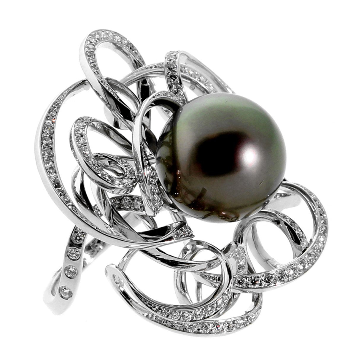 An exquisite Chanel Diamond cocktail ring, this Spirale Perles ring from Chanel possesses an unparalleled degree of detail and intricacy which comes together flawlessly to create a truly cohesive, stylish design. The ring features 1.41cts of the finest Chanel round brilliant cut diamonds surrounding a 14.5mm pearl in 18k white gold.
