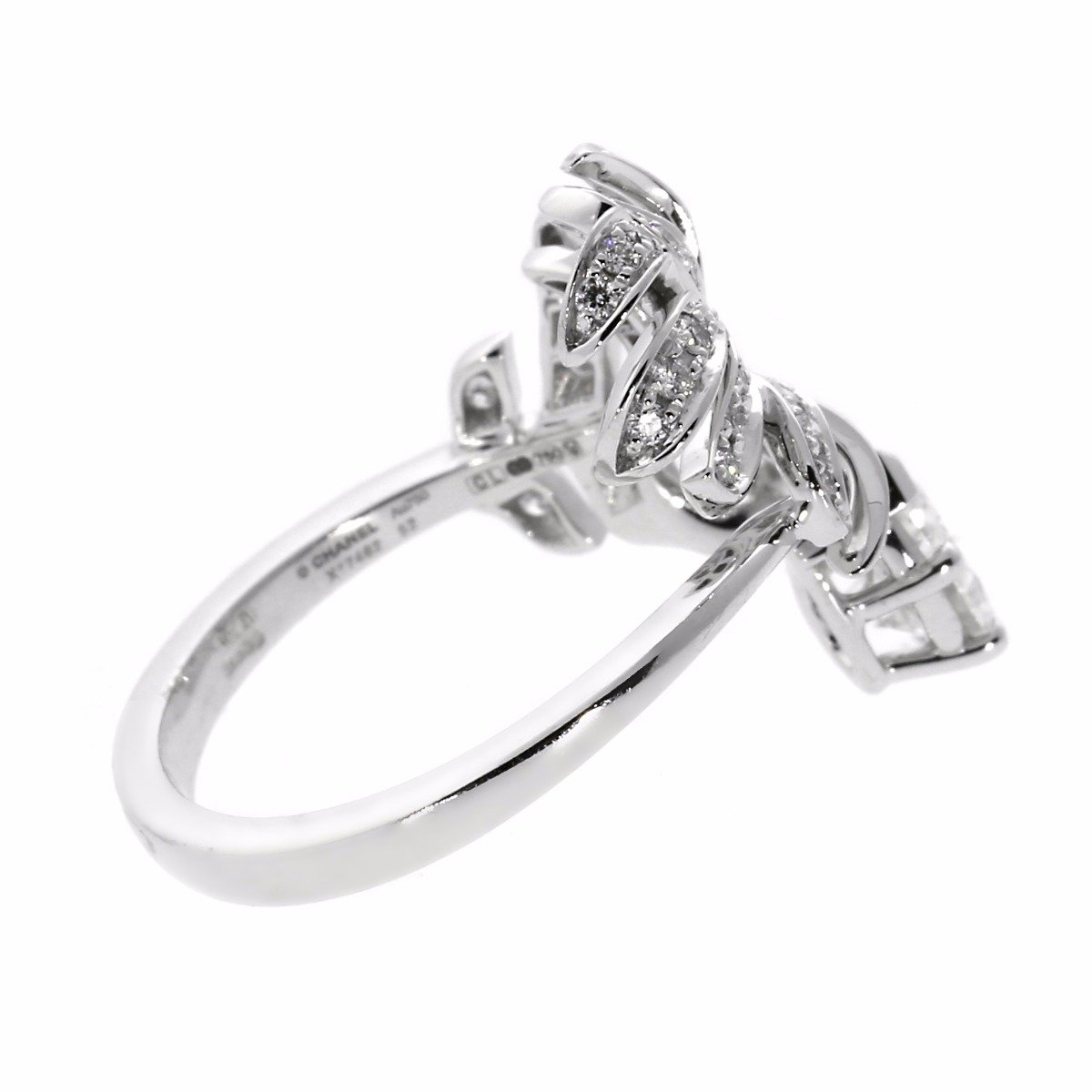 A beautiful Chanel plume diamond gold cocktail ring from the Plume de Chanel collection, that features a feathered motif with approximately .85 carats of diamonds set in Chanel white gold. This delicate feather effect is accompanied by one larger pear-shaped diamond.
