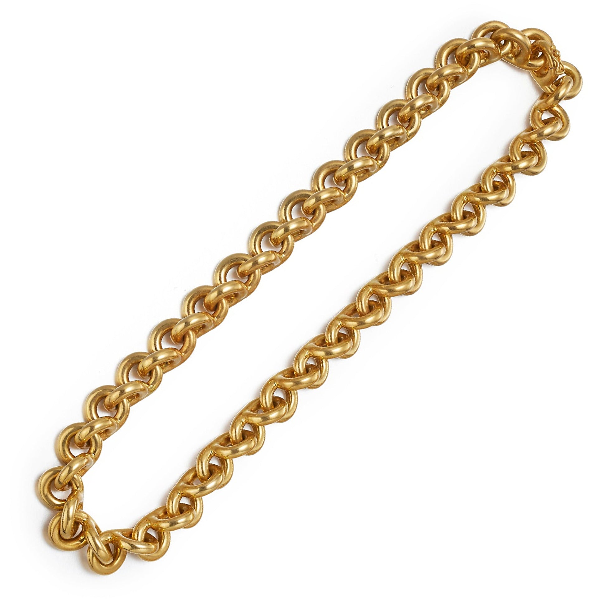 This vintage necklace features a bold and substantial chain, meticulously crafted from 18k yellow gold. Each link of the chain is expertly designed to ensure a seamless and fluid connection, creating a stunning visual impact. The rich, lustrous gold showcases a warm and Celeste glow, highlighting the necklace's exceptional weight and quality.
