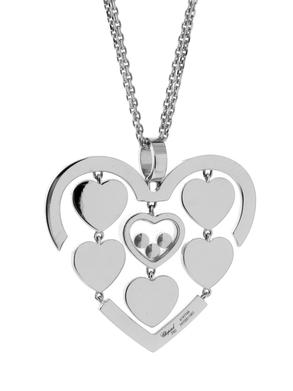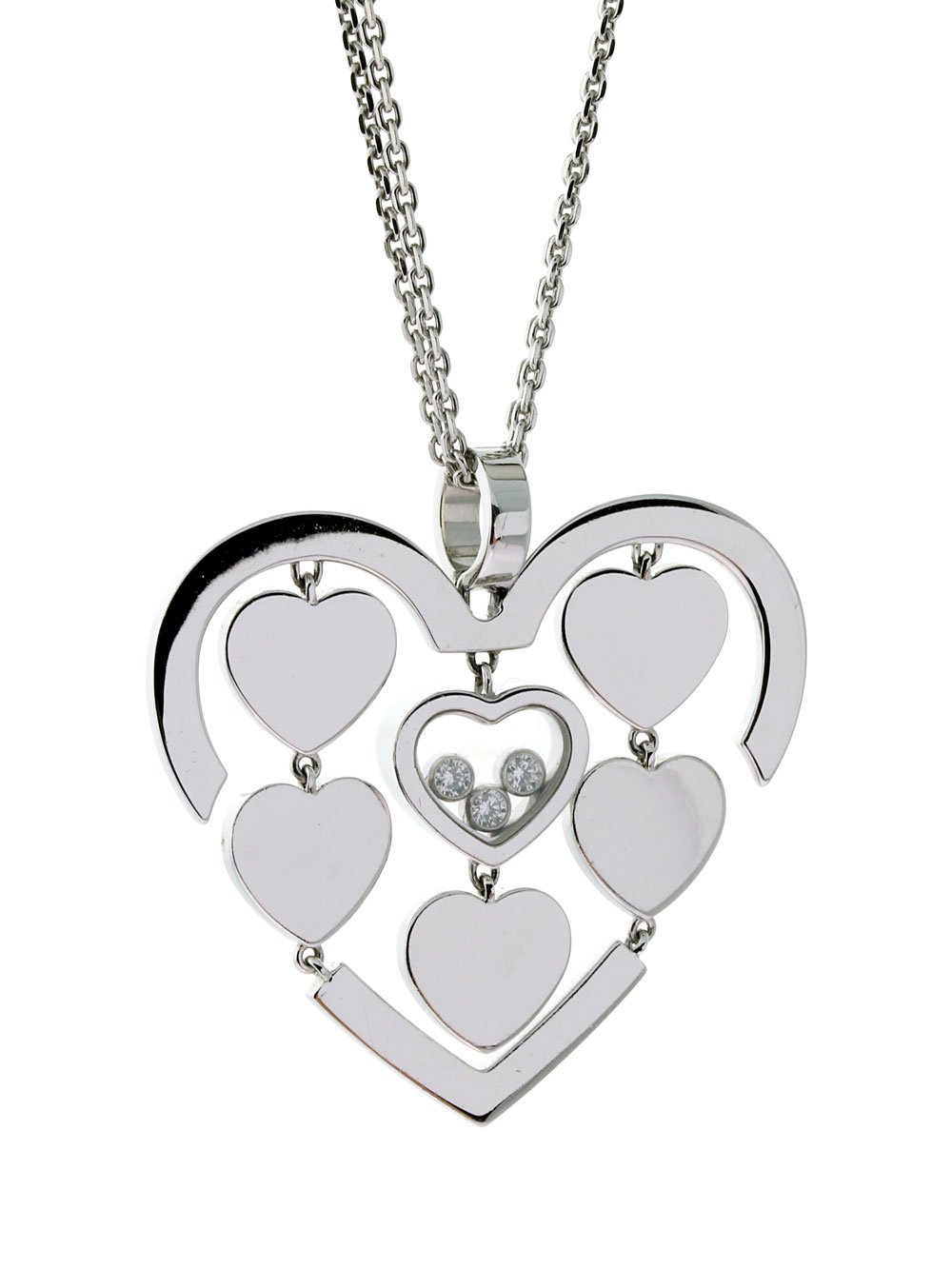 A fabulous Chopard necklace featuring 3 Vs1 E-F color diamonds (.17ct total) comprise the heart and soul of this captivating Amore necklace from Chopard, which uses the iconic Heart symbol in multiple forms and layers to create a decidedly romantic piece. Hanging 23" in length and made from sleek 18k white gold, this necklace effortlessly blends refined sensibility with sensual grace.
