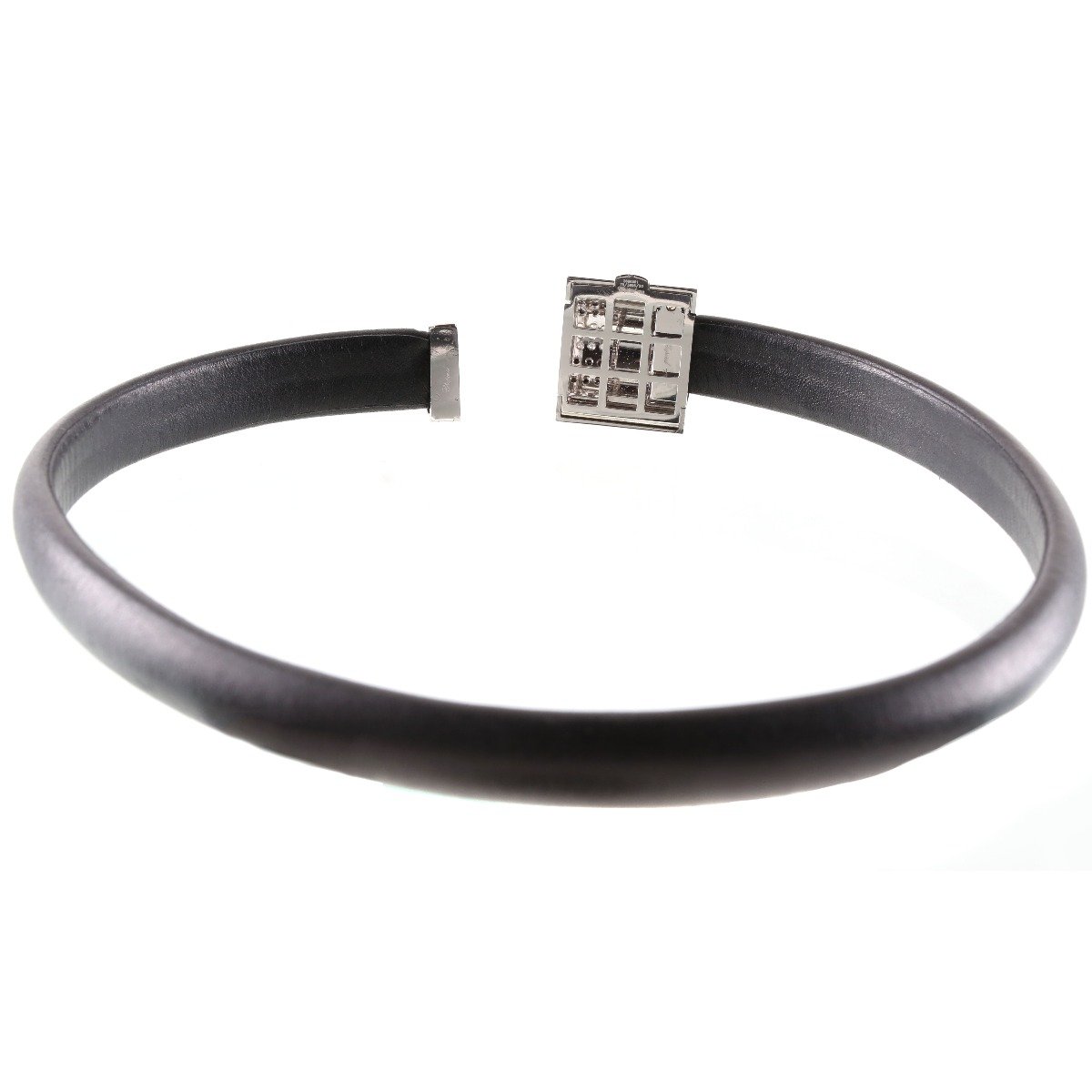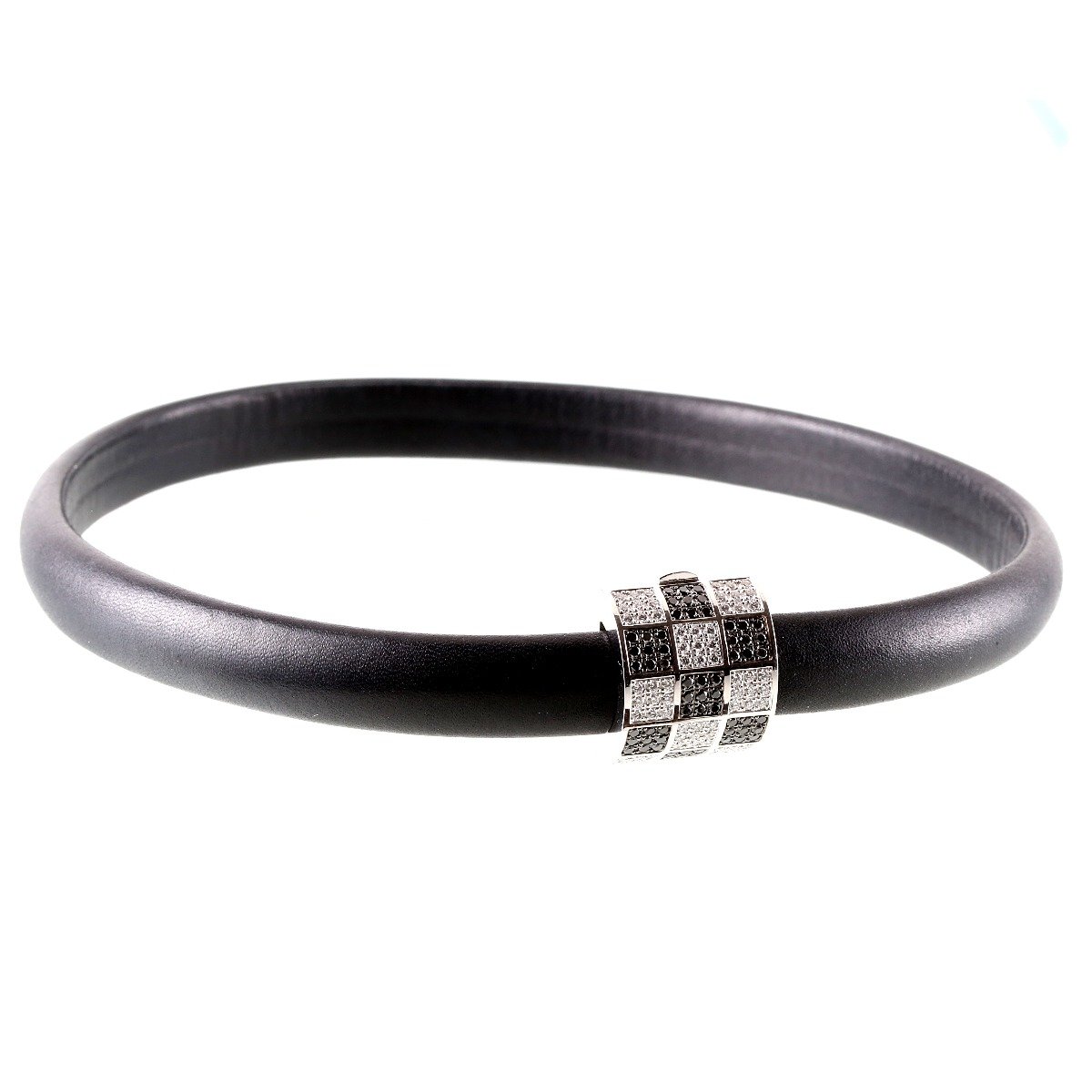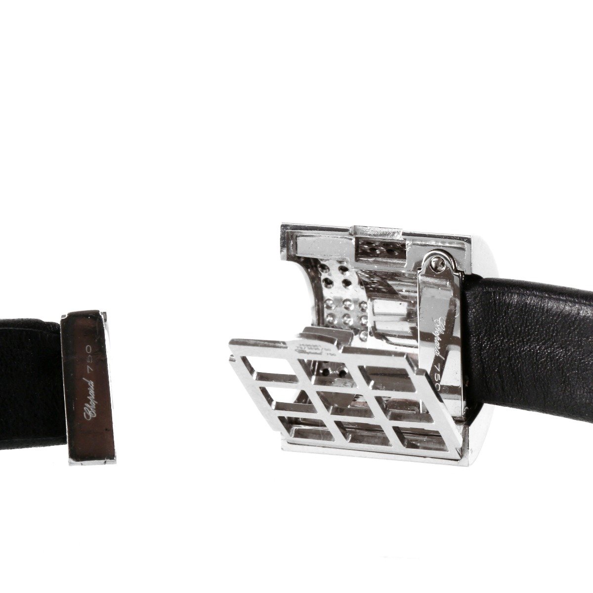 A modern and elegant diamond choker necklace by Chopard. Round brilliant black and white diamonds, set in 18kt white gold, form an alternating checkerboard pattern on the center component. The soft edged black leather choker is connected by a hidden closure within the checkerboard piece.