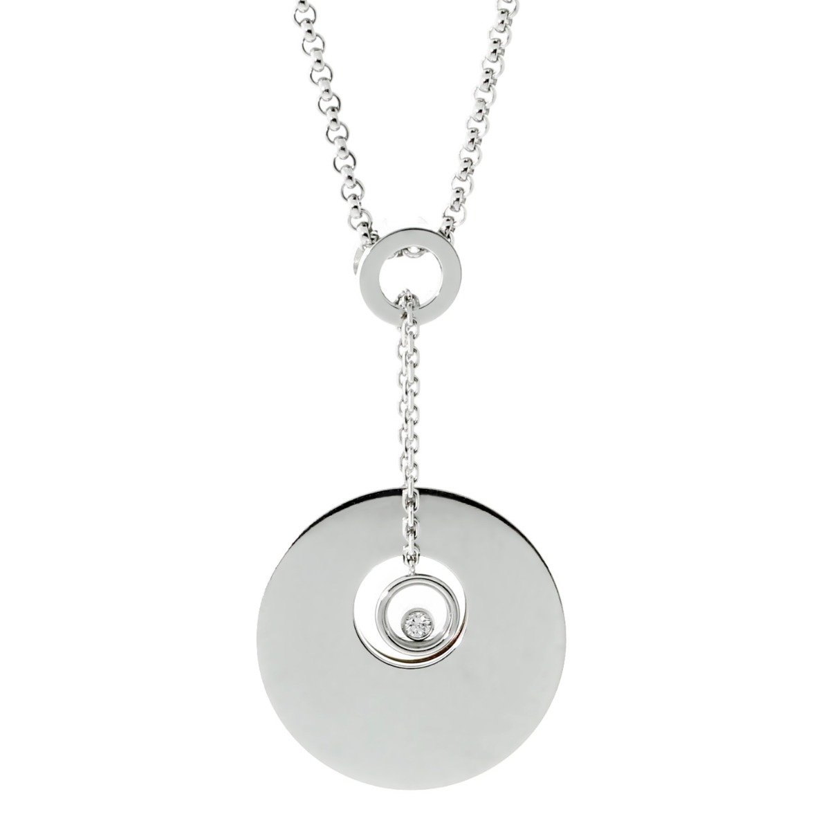 This happy diamond clover necklace by Chopard is unique both color and design. An open, rose gold clover nestles adjacent to a larger, high polished white gold disk and is connected by a white gold link chain. In the center of the larger disk dangles a tiny circle adorned with a .05cts Vs 1 E-F color diamond.