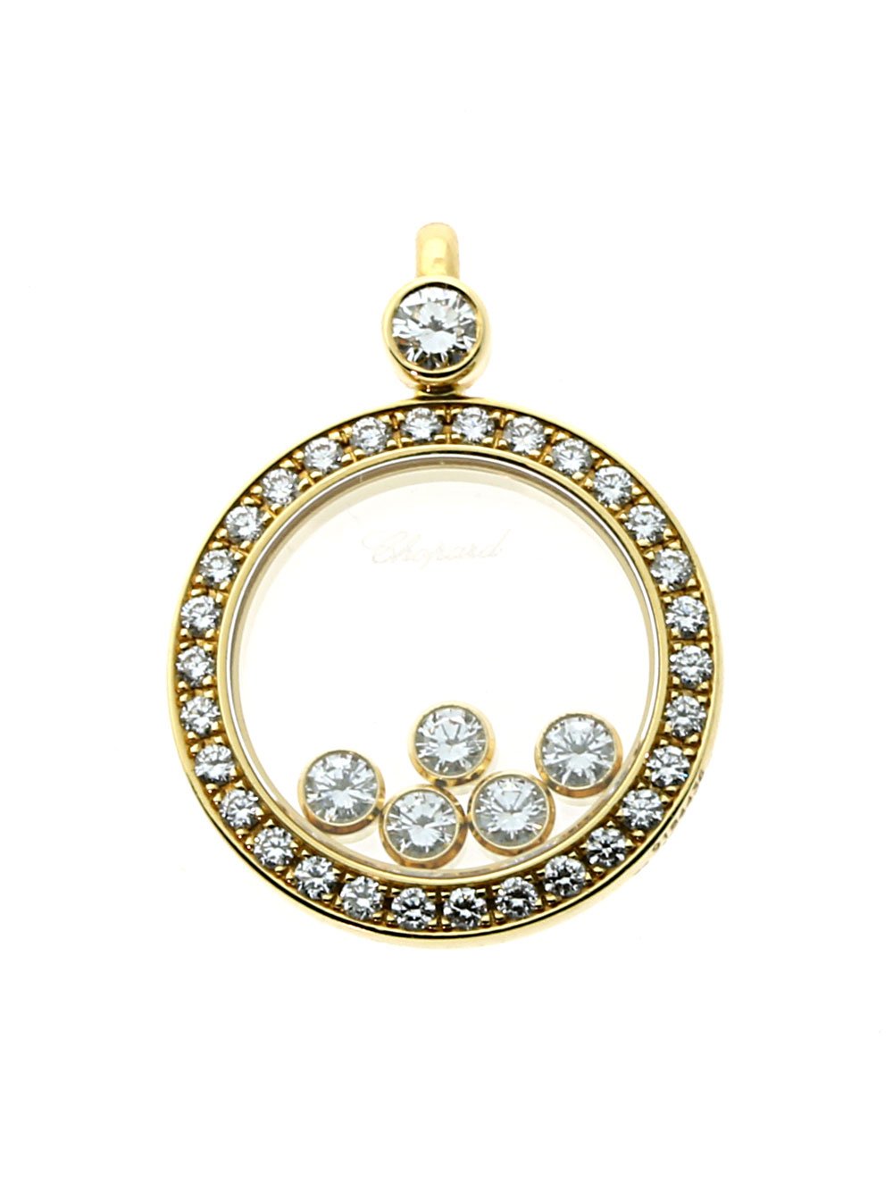 Whether you're looking for that perfect anniversary gift or simply wish to add to your own fine jewelry collection, this Chopard circle pendant will delight any diamond lover. Round brilliant cut diamond accent stones are delicately pave set around the large open circle that creates the framework of this piece. Five floating diamonds of a larger size are inside the circle. Full bezels in yellow gold encase each individual diamond. The warm, rich tone of the yellow gold creates a lovely contrast with the brightness of the diamonds. The largest diamond of all sits atop the pendant. From the pave accents to the incredible diamond bail, this stunning piece features a total of 36 precious stones.