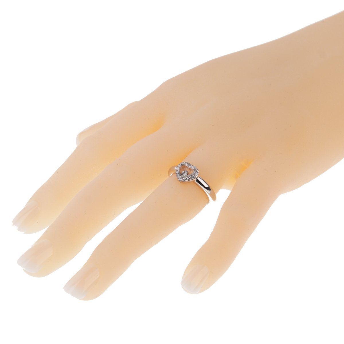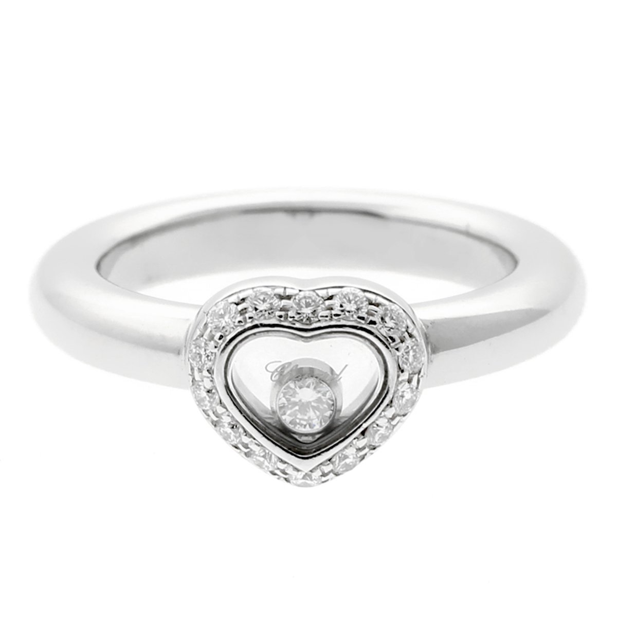 This enchanting heart shaped ring from Chopard's happy diamond collection is perfect in size and scale. Finely crafted in 18k white gold, the three dimensional heart shape is set with round white diamonds and inlaid with an additional larger, bezel set diamond. With a high polished rounded band, this heart shaped beauty confirms, once again, why the Happy Diamonds line is so beloved around the world!