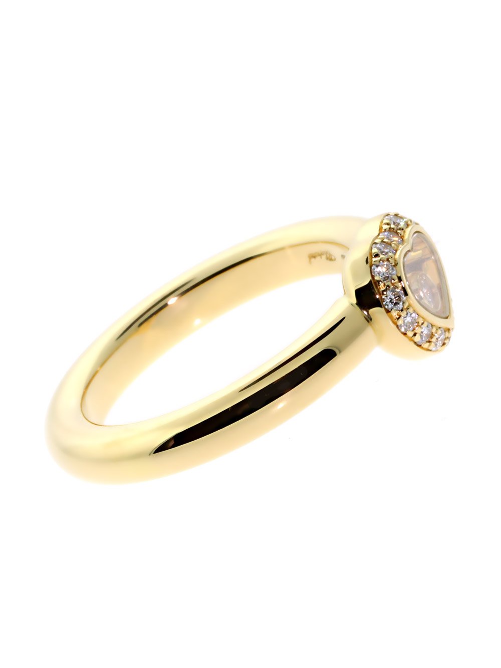 This enchanting 18k Yellow Gold Chopard Ring hits all the right notes and confirms once again why the Happy Diamonds line is so beloved around the world! Vs1 E-F Color Diamonds line the Heart-shaped Motif, which features a transparent core that hosts a lone sparkly Diamond of its own - no doubt meant to represent the significance of the one true love of your life. Equal parts sensual and romantic, this Ring is an artistic achievement unto itself!