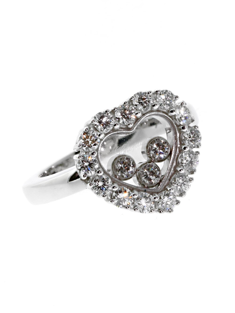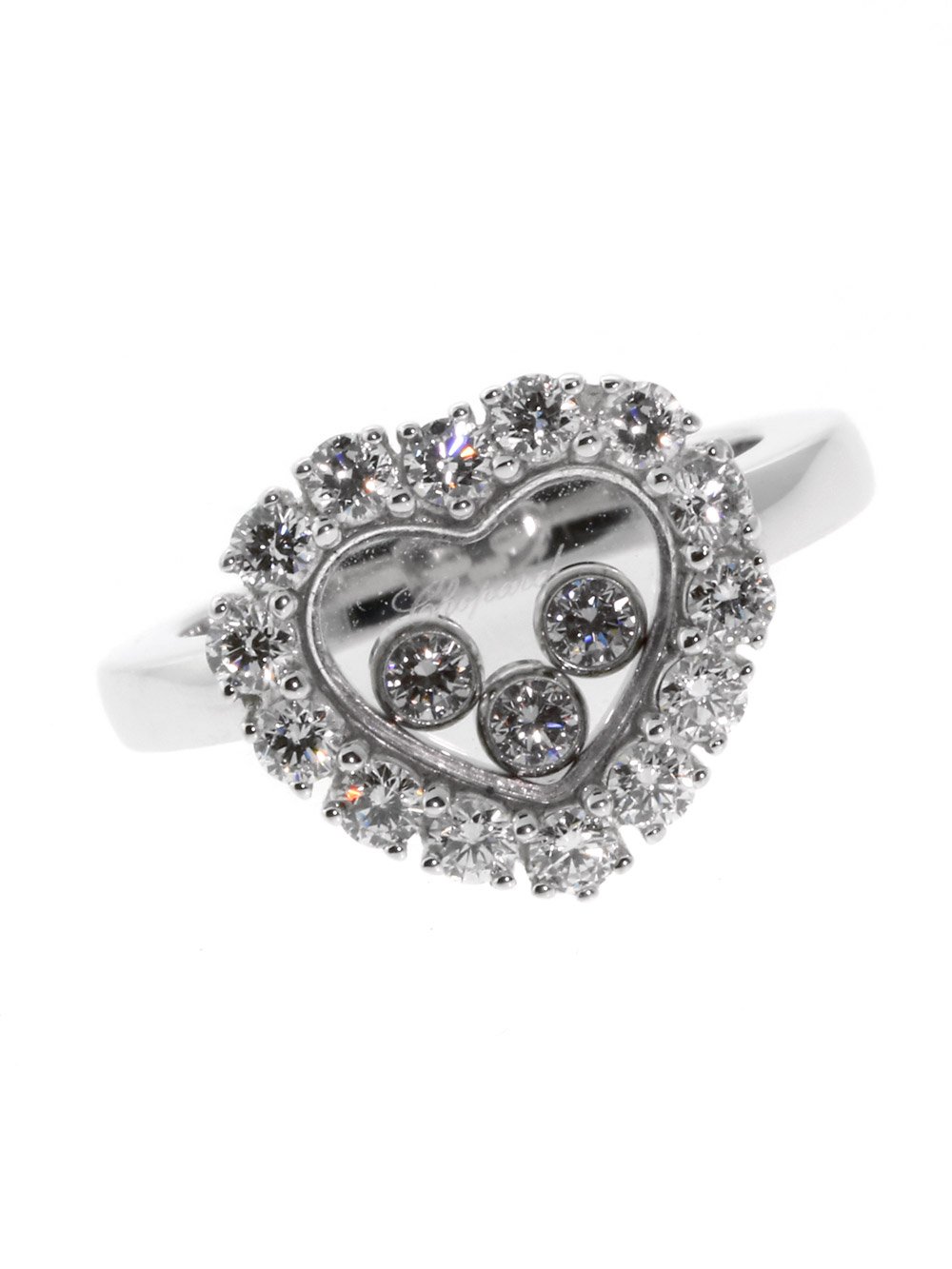 The Happy Diamonds Collection from Chopard has produced countless pieces of astonishing grace and beauty over the years, but even by those already-lofty standards, this stunning 18k White Gold Ring is a true stand-out! Boasting 17 Vs1 E-F Color Diamonds (adding up to .69ct in total) set into a ravishing Heart pattern, this is a piece that's proud of its romantic ambitions. Happy Diamonds at its best!