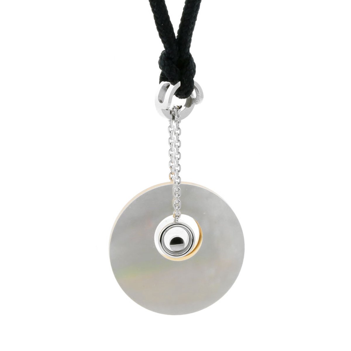 An amazing combination of color, texture and design makes up the reversible four leaf clover necklace by Chopard. Adjacent to a round smooth mother of pearl disc nestles a smooth 18k rose gold clover, both attached to a white gold link chain. Inside the clover is a white gold circle featuring a .05ct Vs1 E-F color floating diamond. Both the rose gold flower and mother of pearl disc are in contrast to the sleek black cord necklace.