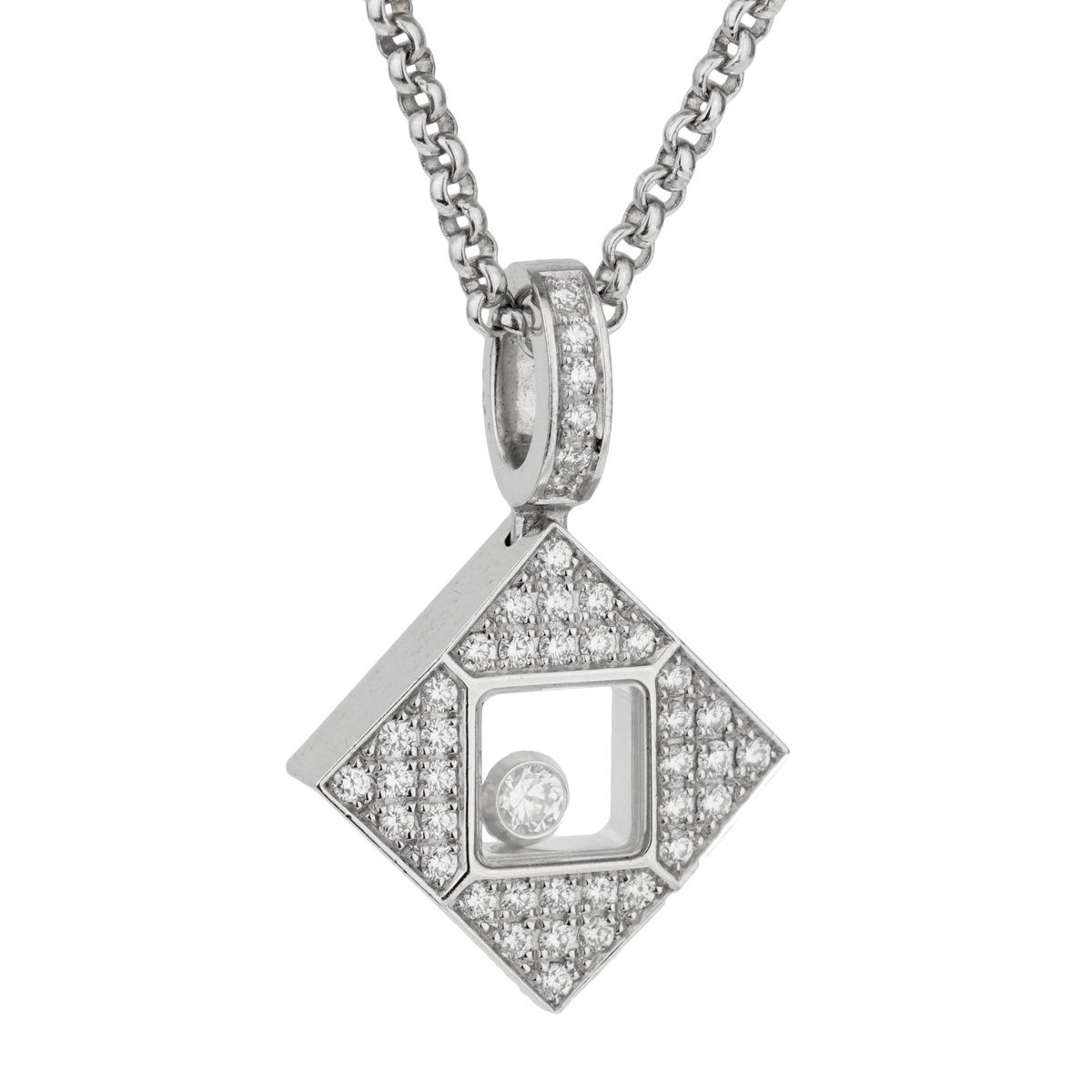 Exemplifying timeless elegance and the epitome of sophistication, the Chopard Happy Diamonds Square White Gold Necklace is a masterpiece, harmoniously fusing geometric allure with the ethereal beauty of diamonds. It serves as a testament to Chopard's unwavering commitment to luxury and design precision.