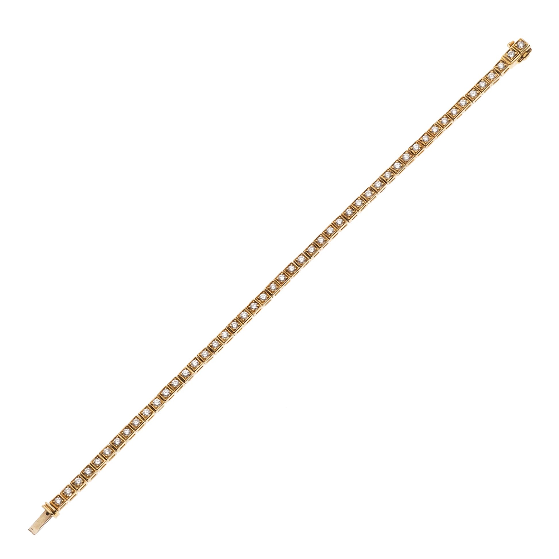 Crafted with meticulous attention to detail, this bracelet features a series of square links, each forged from 18k yellow gold. The gold itself is chosen for its rich, warm hue and enduring quality, ensuring that the bracelet not only looks magnificent upon first wear but continues to shine with the same intensity through years of adornment. These square links are seamlessly connected, offering a comfortable, secure fit that allows the bracelet to drape elegantly around the wrist, making it a versatile addition to any attire, from the most formal evening gowns to casual daytime looks.