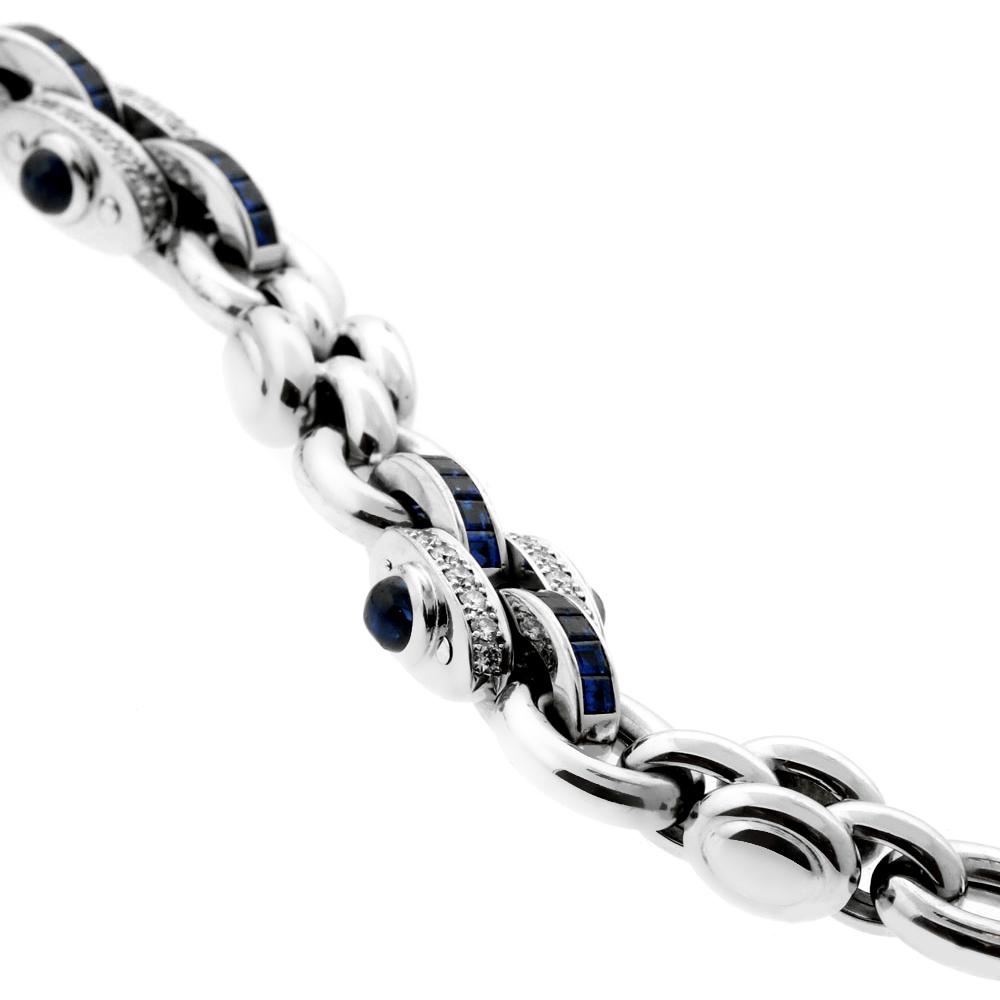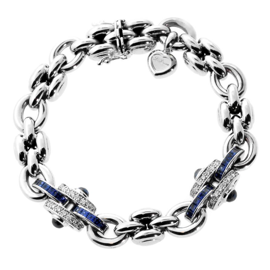 This magnificent, heavy link sapphire and diamond white gold bracelet is finely crafted by Chopard. The bracelet features solid 18kt white gold oval links that are adorned with two dazzling interlocking sapphire and diamond links. The deep blue sapphires are channel set, while the (.80cts) of diamonds are prong set in the design. The bracelet is finished with a box invisible style clasp adorned with a dangling solid white gold heart charm.