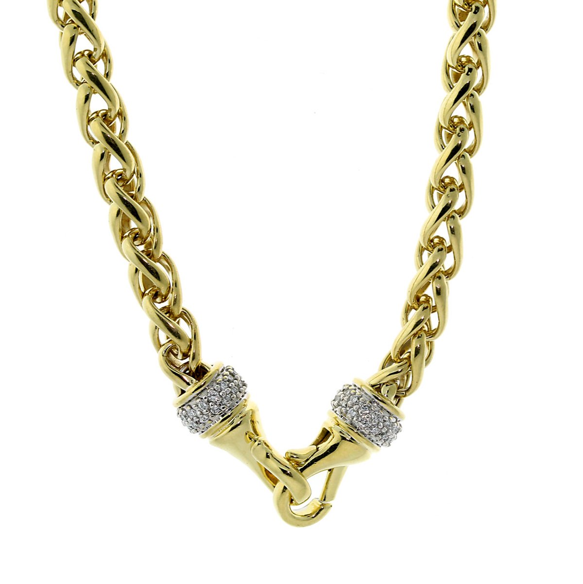 Channeling both strength and elegance, this 18k Yellow Gold Wheat Necklace represents David Yurman's signature brand of "New York cool" perfectly. The 15" Yellow Gold Necklace features a stylish chain design which is rendered all the more appealing by the sparkling Vs F-G Color Round Brilliant Cut Diamonds which grace both ends near the clasp. Authentic American luxury at its finest!