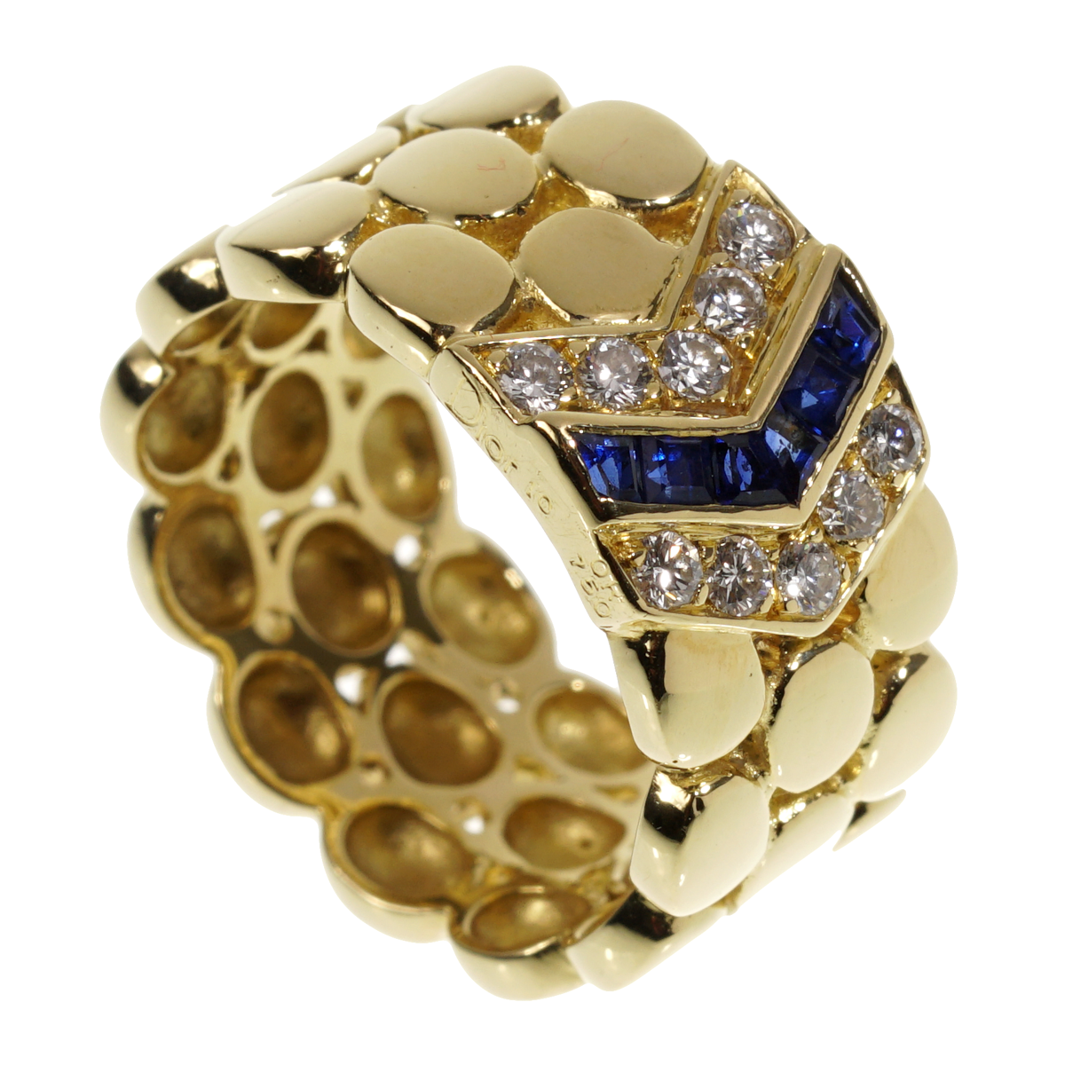 A vintage Christian Dior band style ring showcasing 10 round round brilliant cut diamonds surrounding 6 deep blue sapphires in 18k yellow gold. The ring measures a size 6 3/4