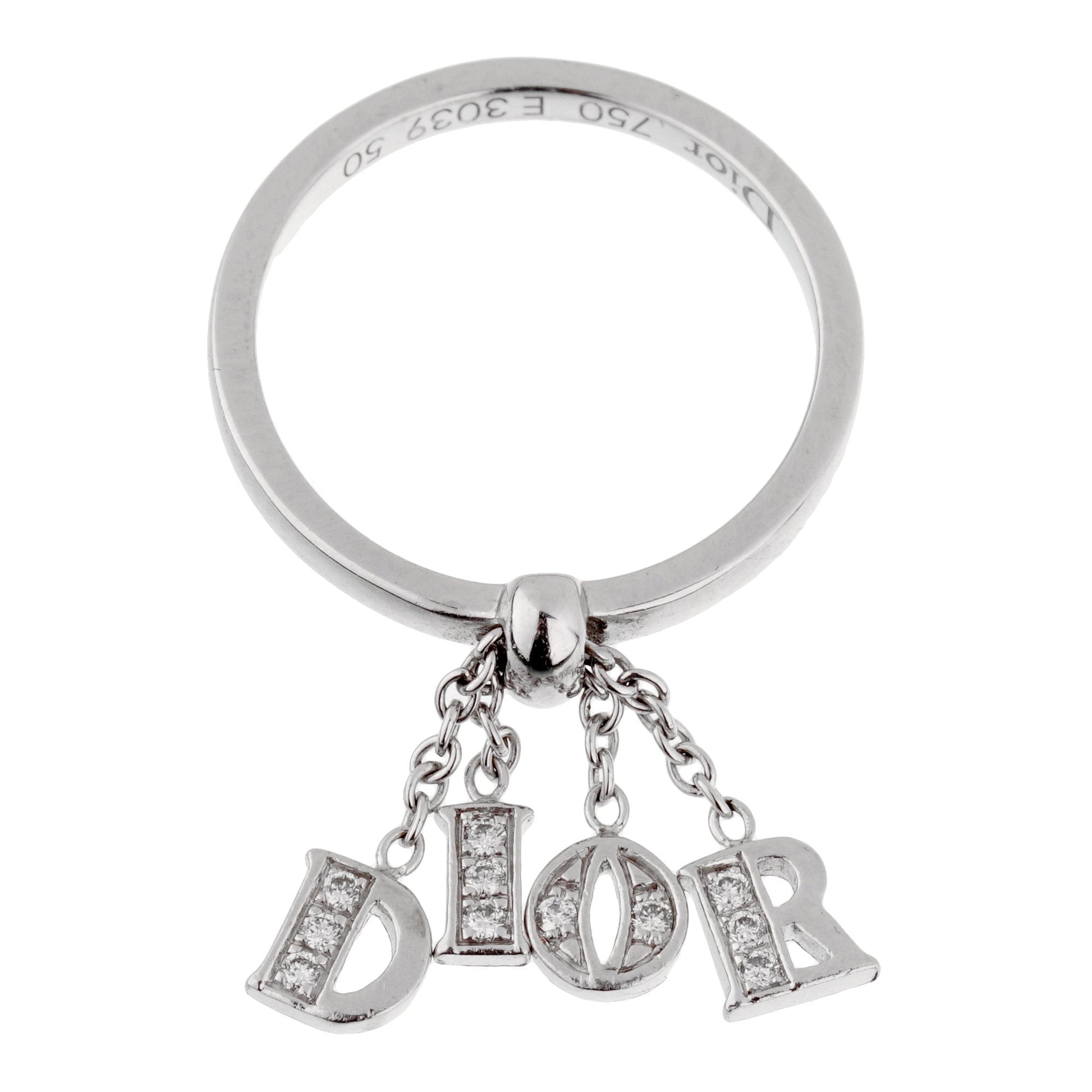 A chic Christian Dior white gold diamond ring showcasing 4 separate D I O R letters freely floating set with round brilliant cut diamonds. The ring measures a size 5 and can be resized.