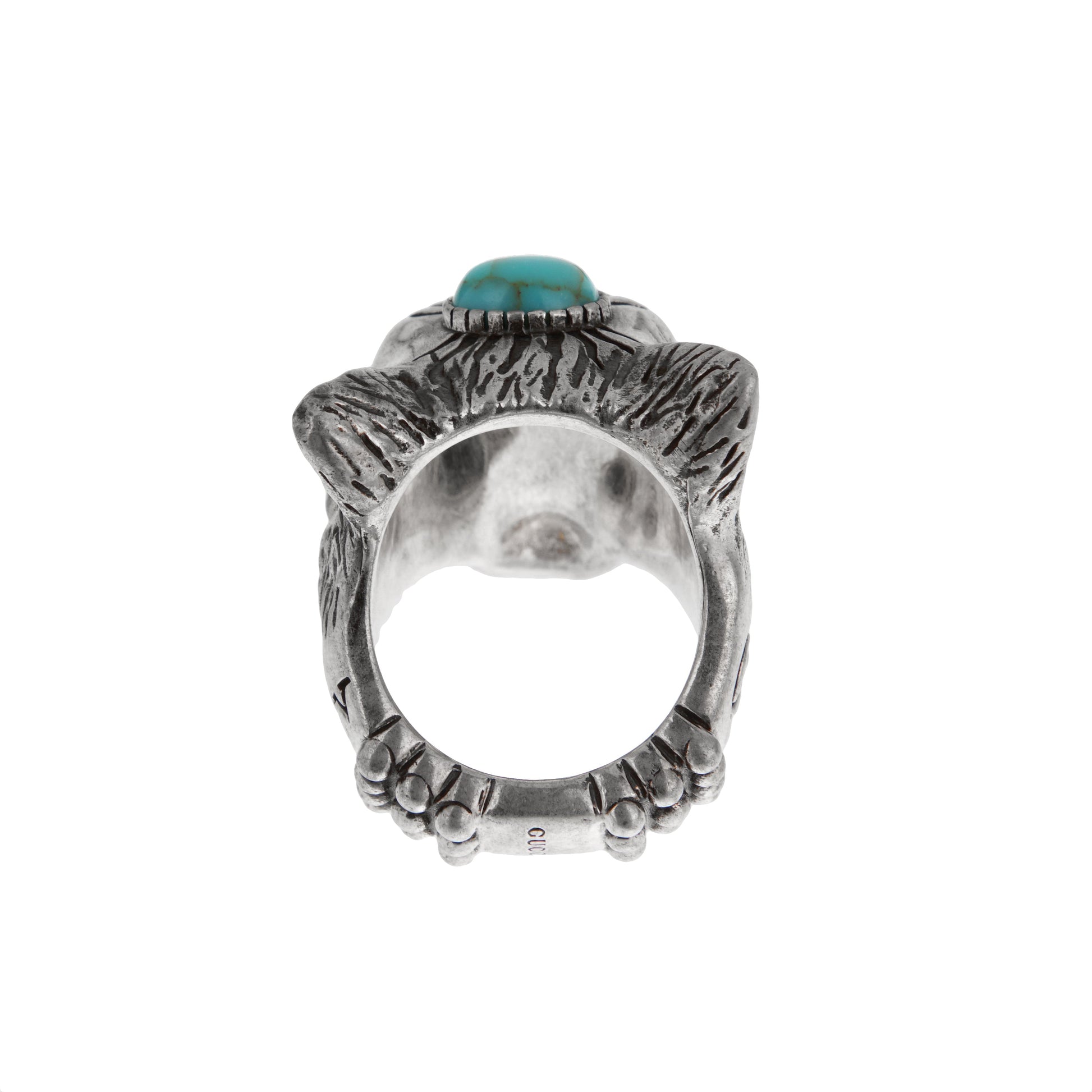 Unleash your wild side with this fierce Gucci Wolf Head Ring, crafted from antiqued sterling silver. Boldly sculpted into the head of a snarling wolf, the design captures a sense of primal power and raw elegance. The centerpiece is a vivid turquoise cabochon set into the wolf’s forehead, surrounded by engraved sunburst detailing—a symbolic touch that hints at strength, protection, and intuition.