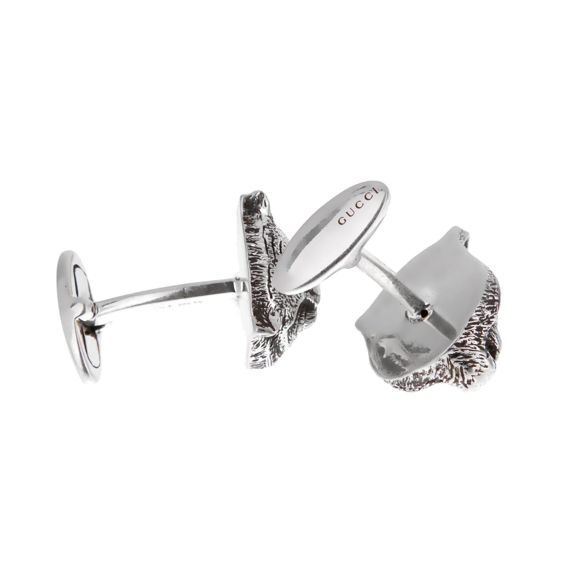 Unleash your inner strength with these fierce Gucci Feline Head Cufflinks, crafted in sterling silver and meticulously detailed to embody bold sophistication. Each cufflink showcases an intricately carved feline head, complete with lifelike texture and expressive features that exude power and refinement. The oxidized finish enhances the depth and dimensionality of the design, capturing the primal energy of the iconic big cat motif.
